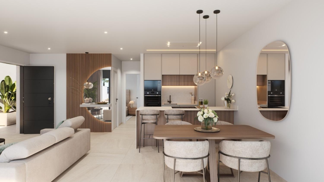 Las villas están cuidadosamente distribuidas con una cocina abierta conectada a una luminosa sala de estar y comedor. Las grandes ventanas de la sala de estar, con persianas motorizadas, proporcionan acceso directo a la zona de la piscina y permiten que la luz natural inunde los espacios interiores.