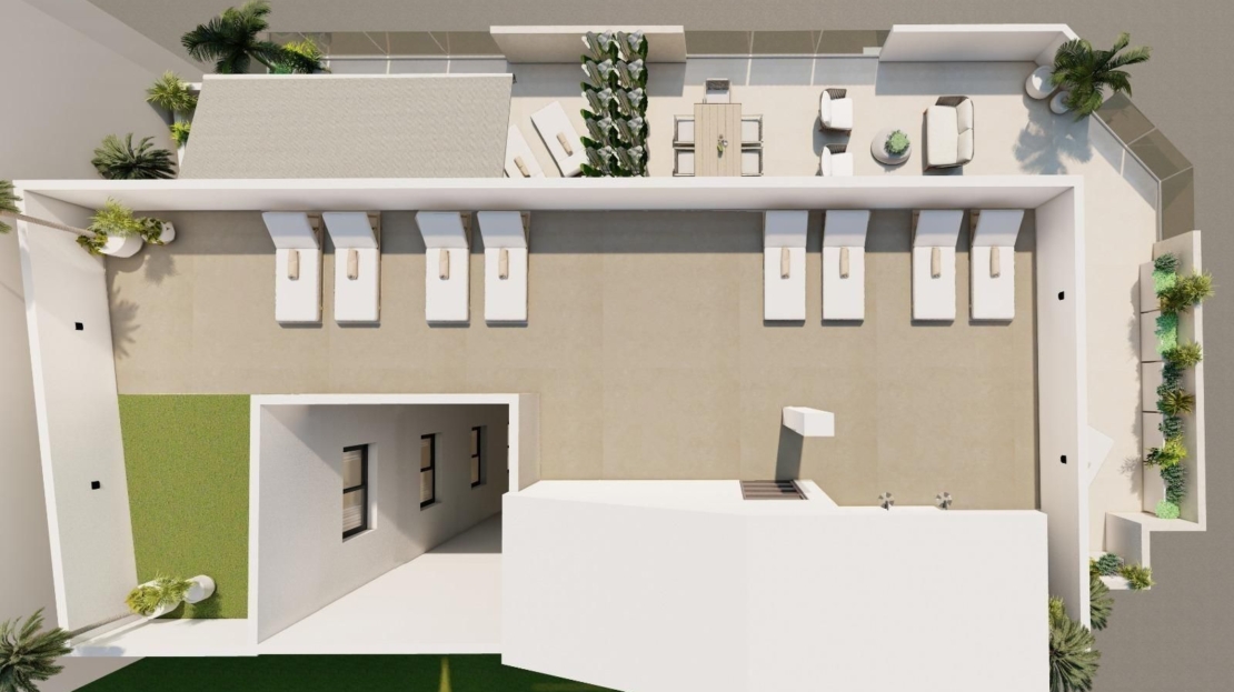 Varje lägenhet har ett kök i amerikansk stil med öppen planlösning, ett ljust vardagsrum med matplats, inbyggda garderober och en privat terrass. I byggnaden finns en hiss för 6 personer och alla boende har tillgång till ett gemensamt takterrass med duschar och konstgräs - perfekt för att njuta av solen och havsbrisen.