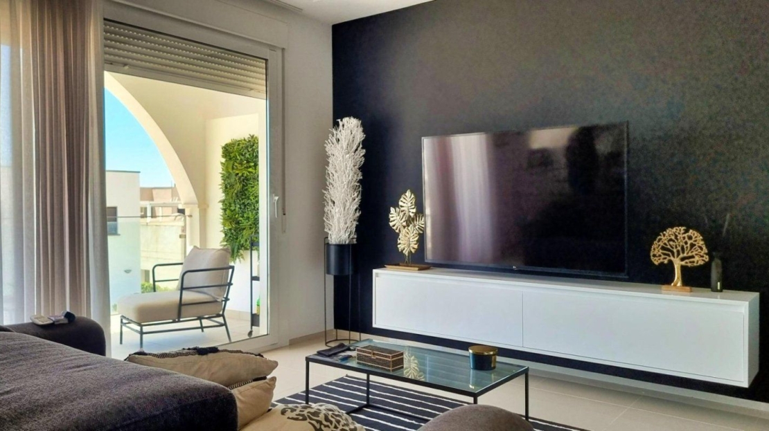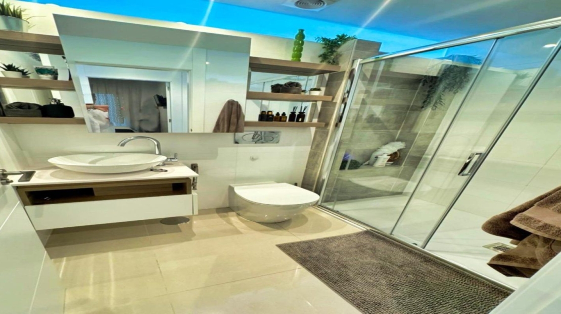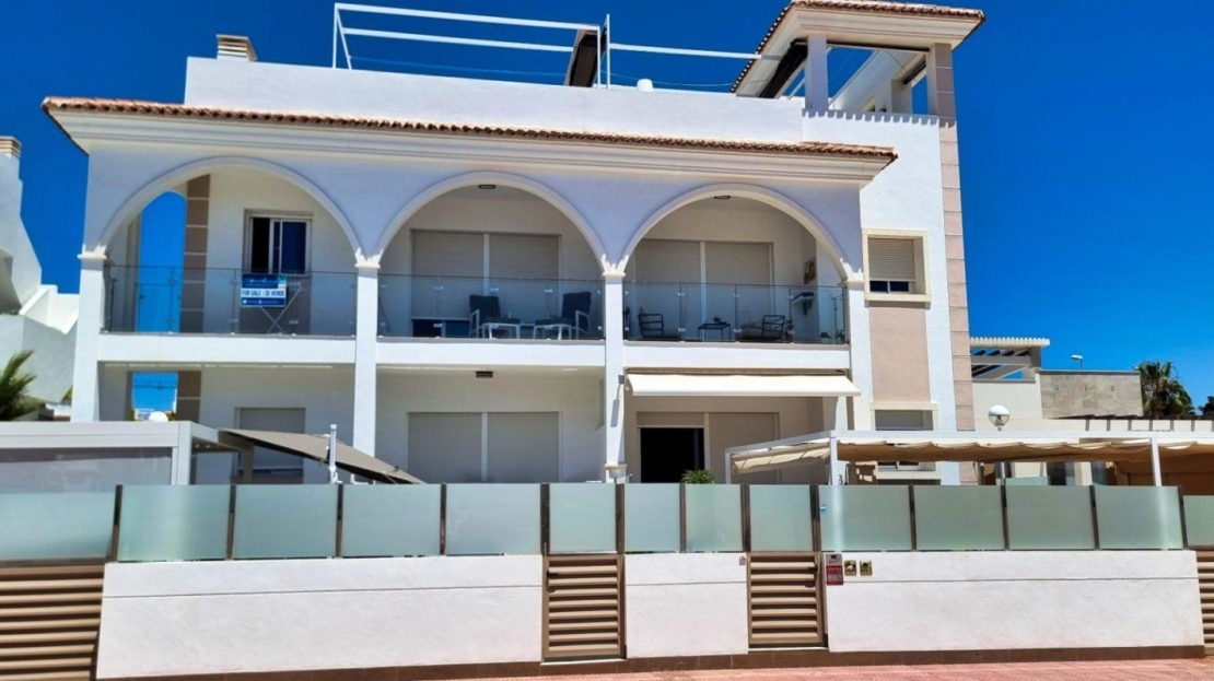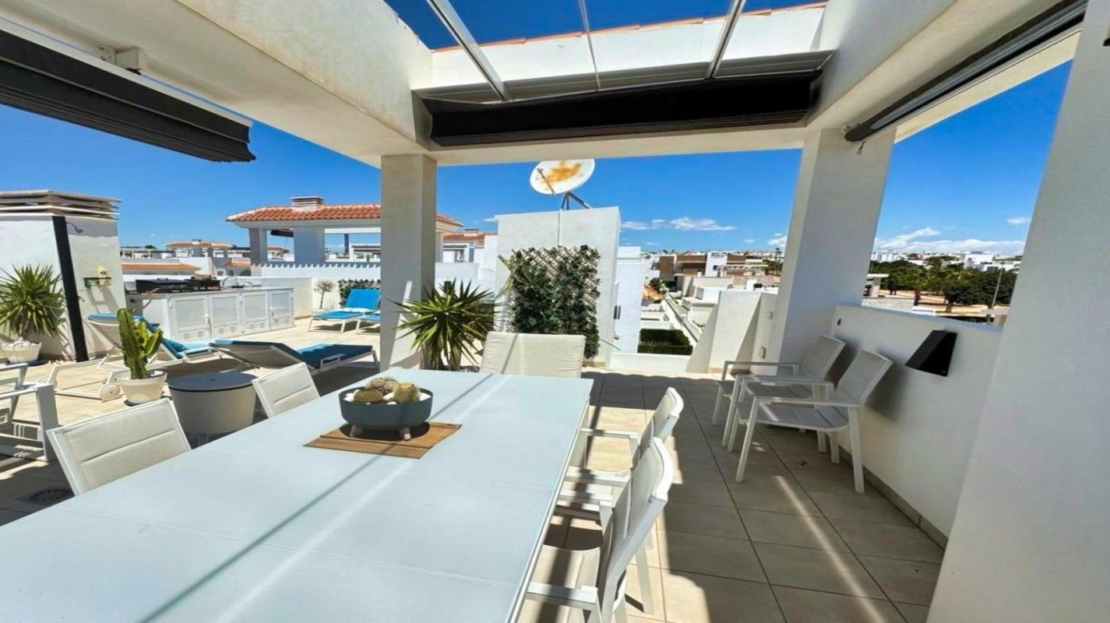 Ciudad Quesada, Doña Pepa, luxury top floor bungalow with 2 bedrooms and 2 bathrooms, 80 m2, with solarium (73m2) with views to the salt lakes, open plan kitchen, living room with fireplace, jacuzzi, summer kitchen, air conditioning, storage room, terrace, sold equipped and furnished.