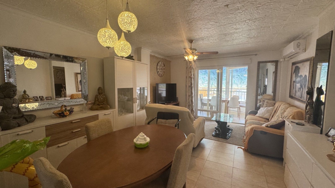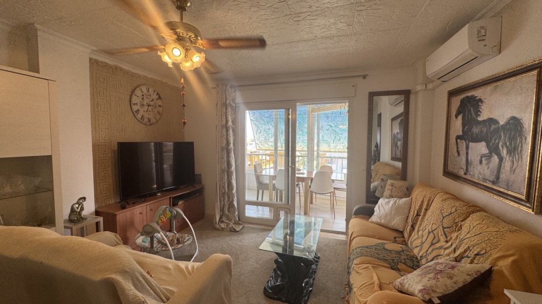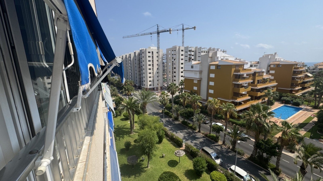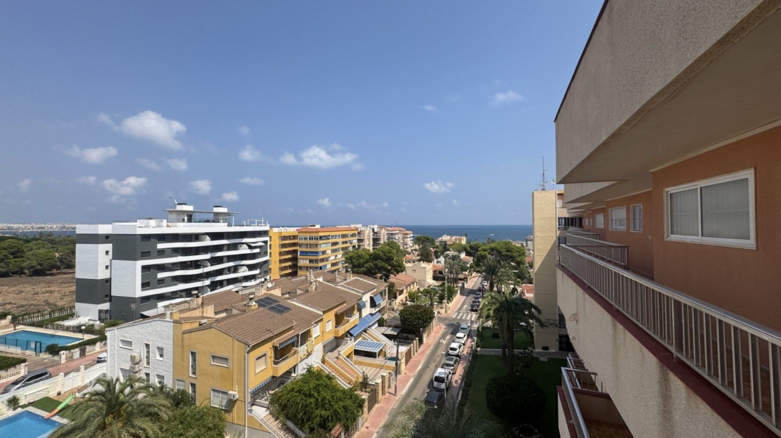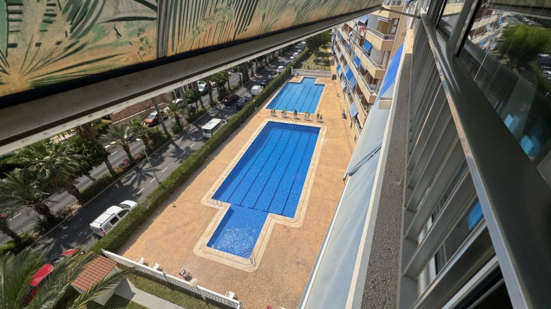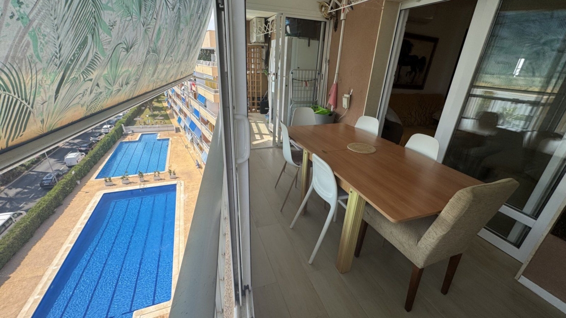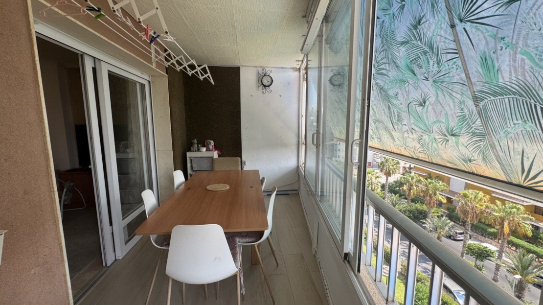 Endast 200 m från havet ligger denna ljusa takvåning på 6:e våningen med 110 m² och en inglasad terrass på 12 m² i söderläge. Den har 3 sovrum (ett med utgång till terrassen), 1 komplett badrum, 1 gästtoalett, vardagsrum/matsal med A/C och fläkt, samt ett renoverat öppet kök med diskmaskin, tvättmaskin och fönster. Bostaden har säkerhetsdörr, säljs möblerad och har hiss, gemensam pool och parkering.