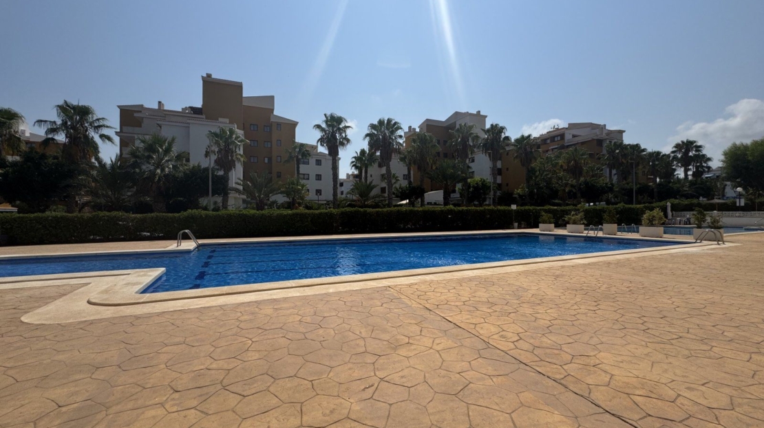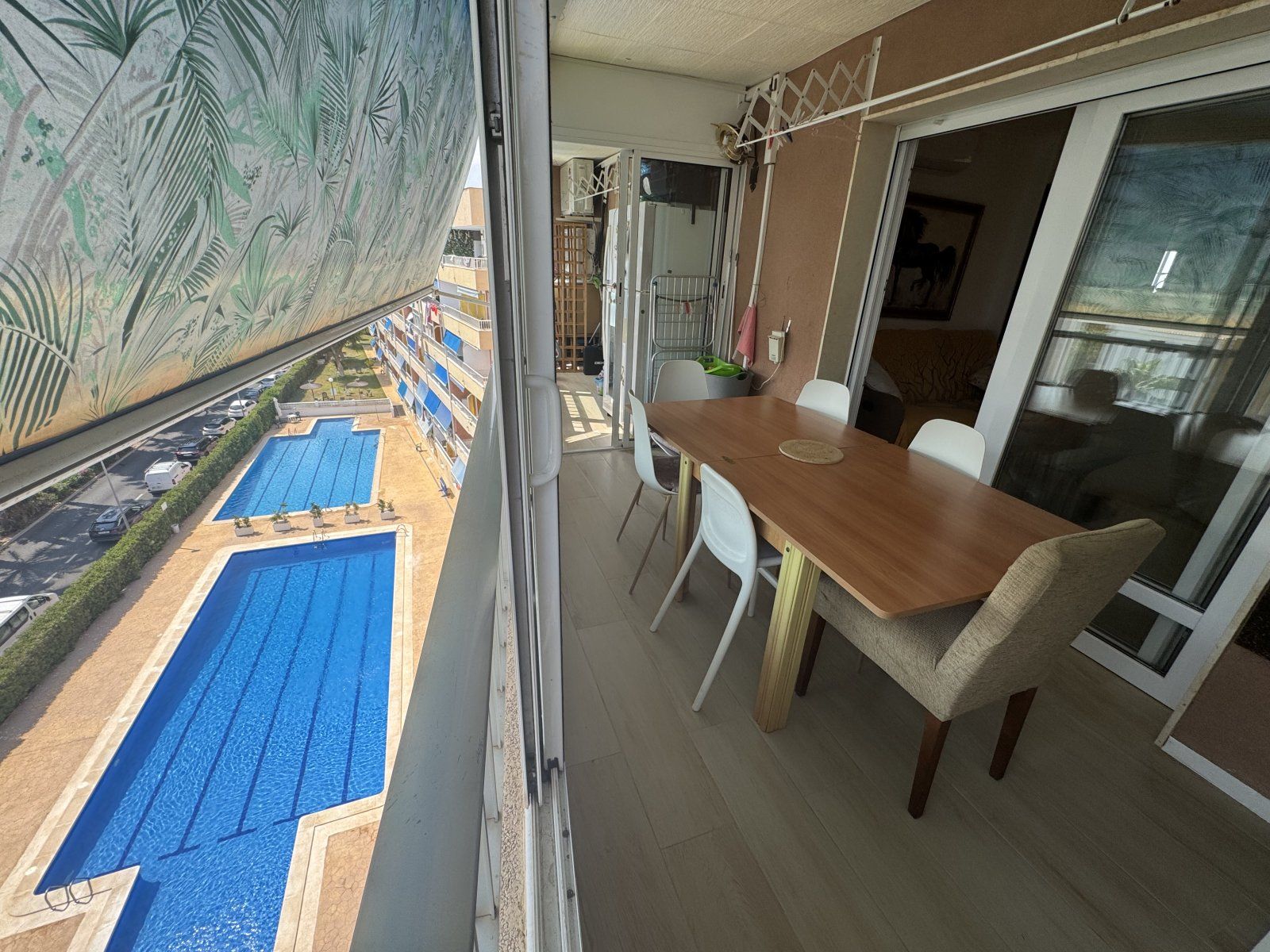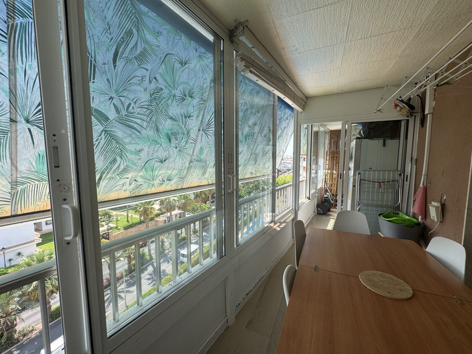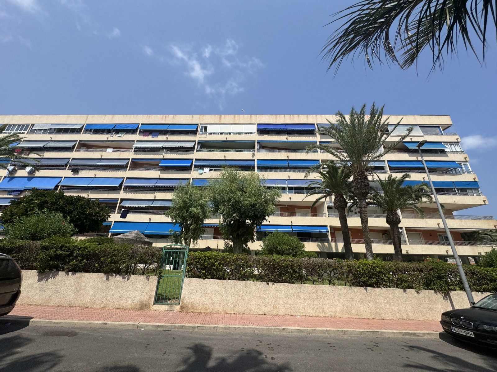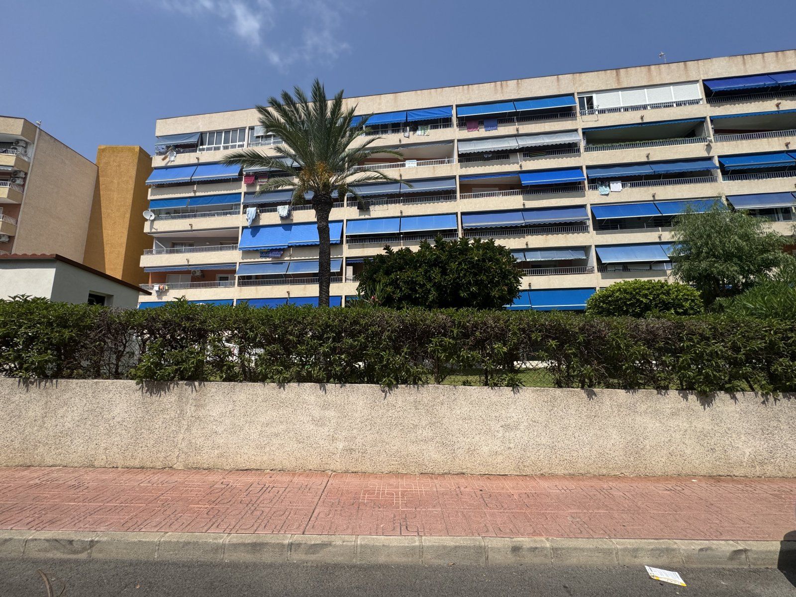 Endast 200 m från havet ligger denna ljusa takvåning på 6:e våningen med 110 m² och en inglasad terrass på 12 m² i söderläge. Den har 3 sovrum (ett med utgång till terrassen), 1 komplett badrum, 1 gästtoalett, vardagsrum/matsal med A/C och fläkt, samt ett renoverat öppet kök med diskmaskin, tvättmaskin och fönster. Bostaden har säkerhetsdörr, säljs möblerad och har hiss, gemensam pool och parkering.