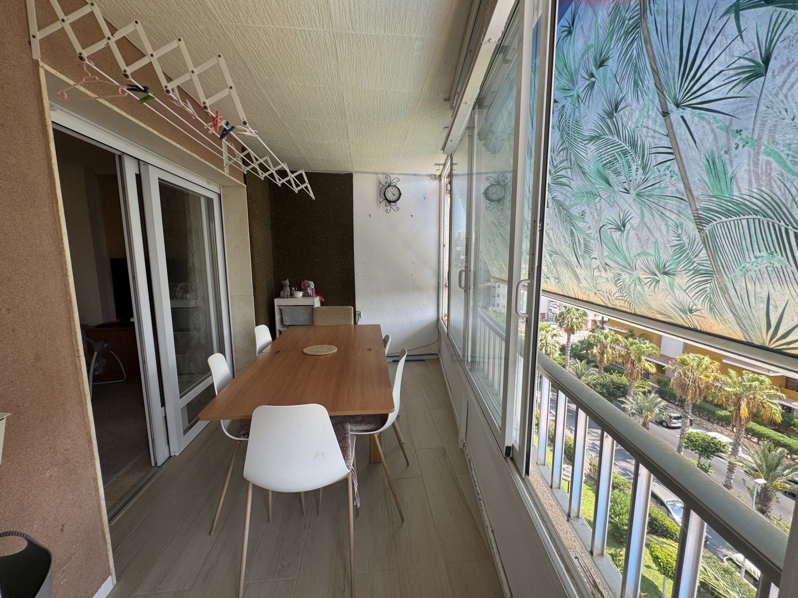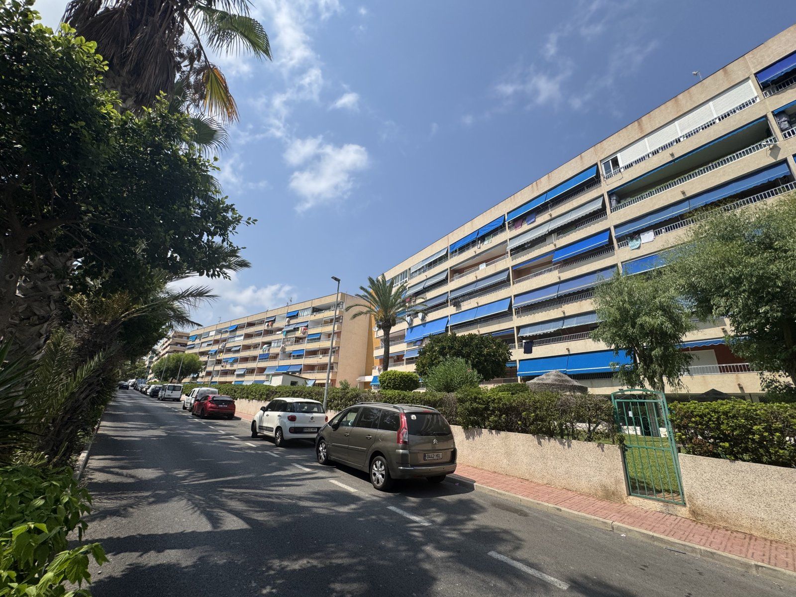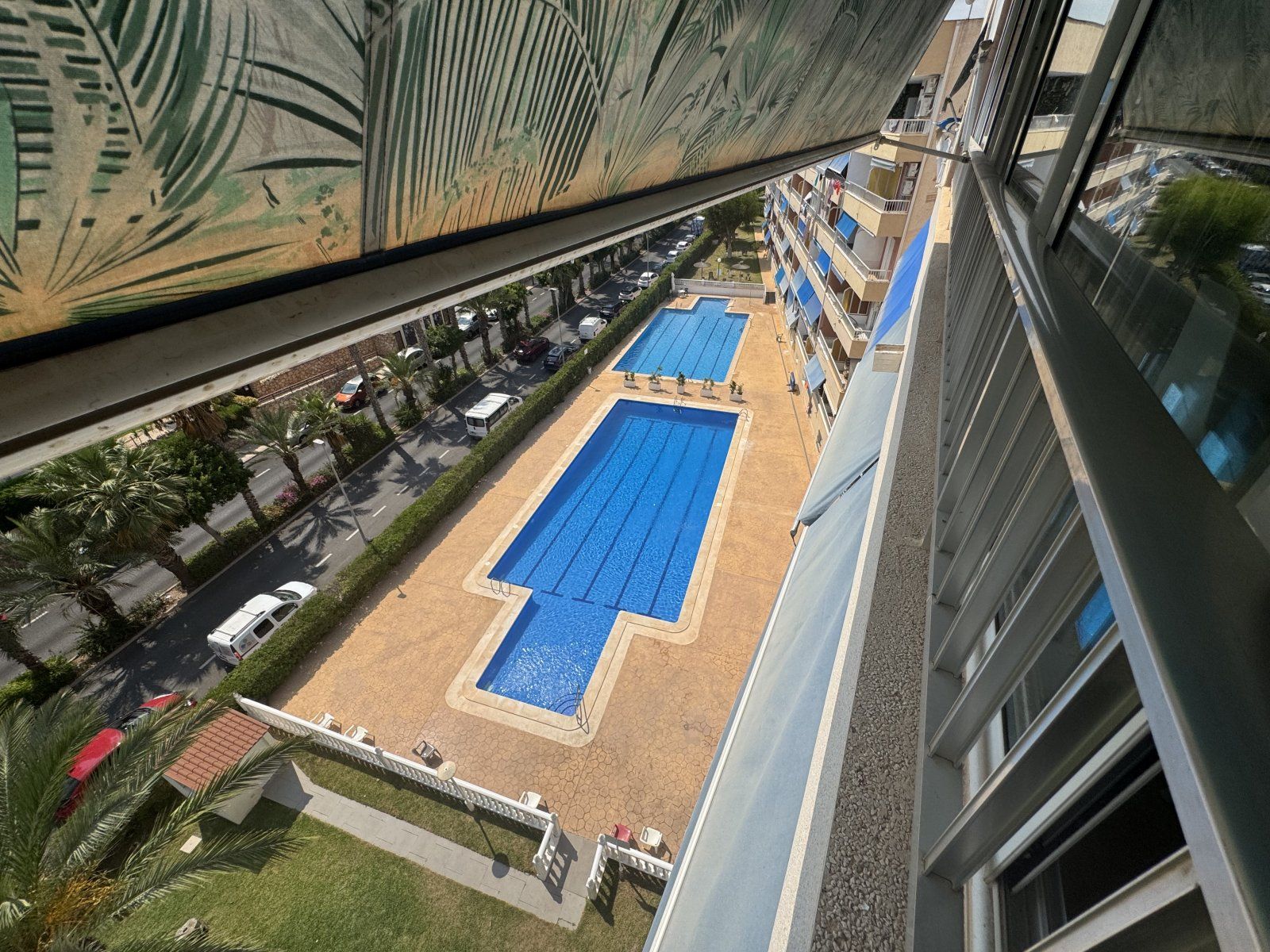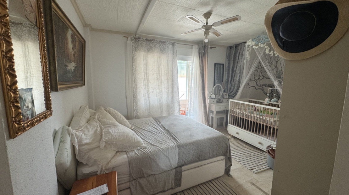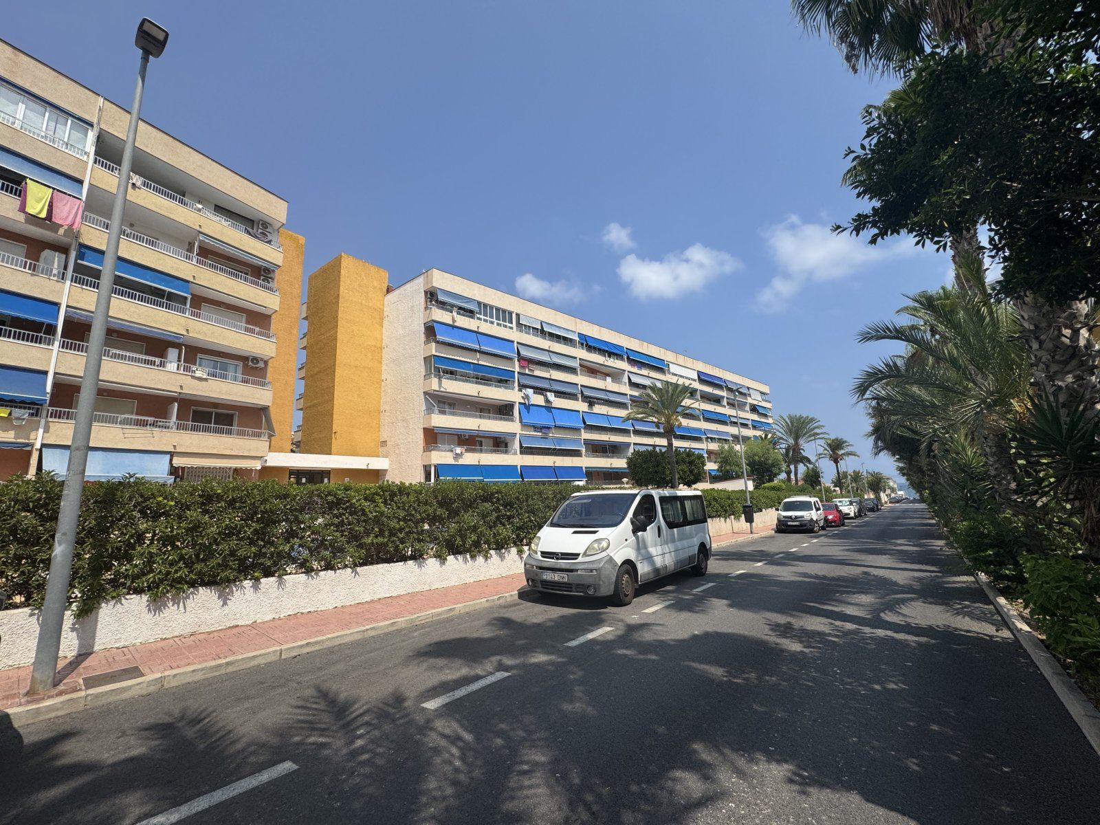 Endast 200 m från havet ligger denna ljusa takvåning på 6:e våningen med 110 m² och en inglasad terrass på 12 m² i söderläge. Den har 3 sovrum (ett med utgång till terrassen), 1 komplett badrum, 1 gästtoalett, vardagsrum/matsal med A/C och fläkt, samt ett renoverat öppet kök med diskmaskin, tvättmaskin och fönster. Bostaden har säkerhetsdörr, säljs möblerad och har hiss, gemensam pool och parkering.