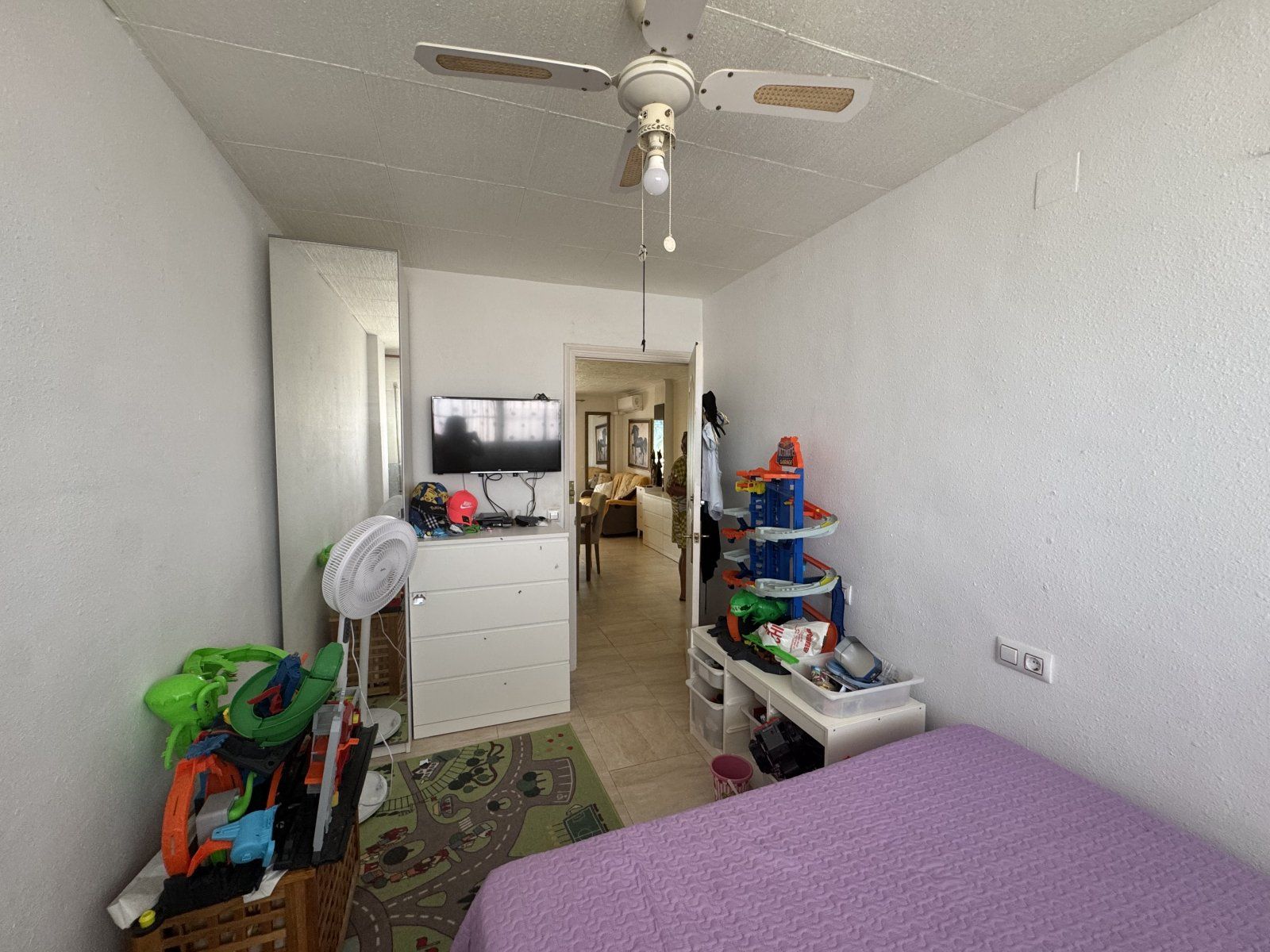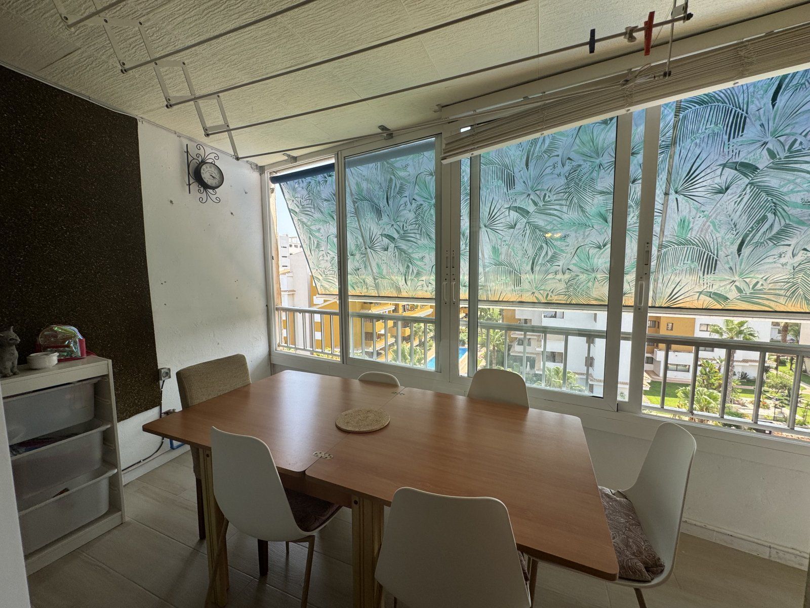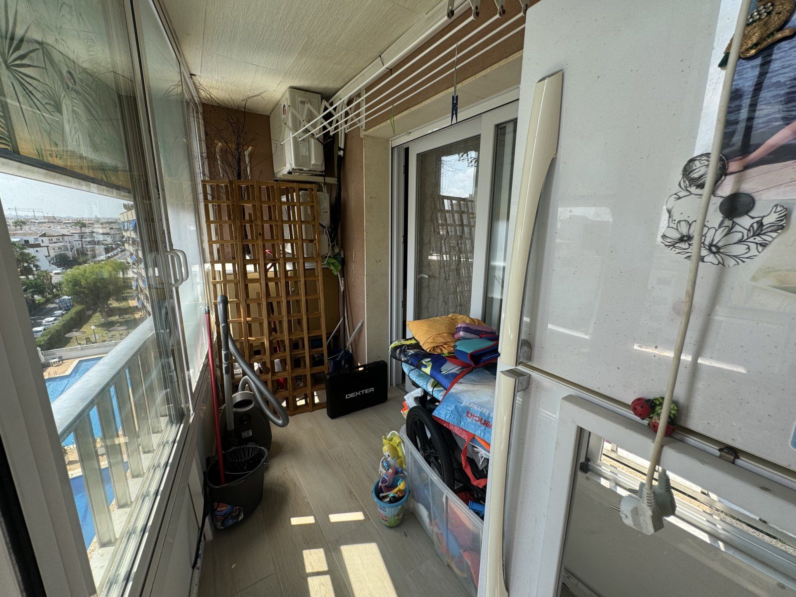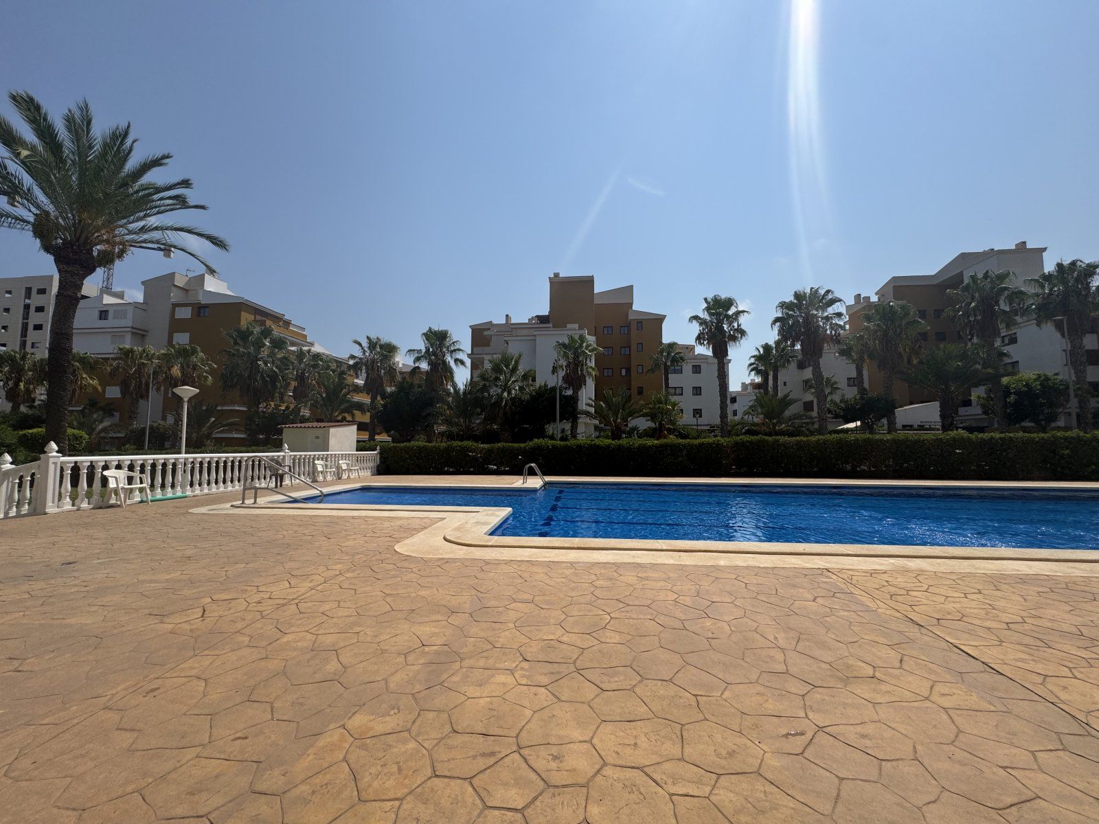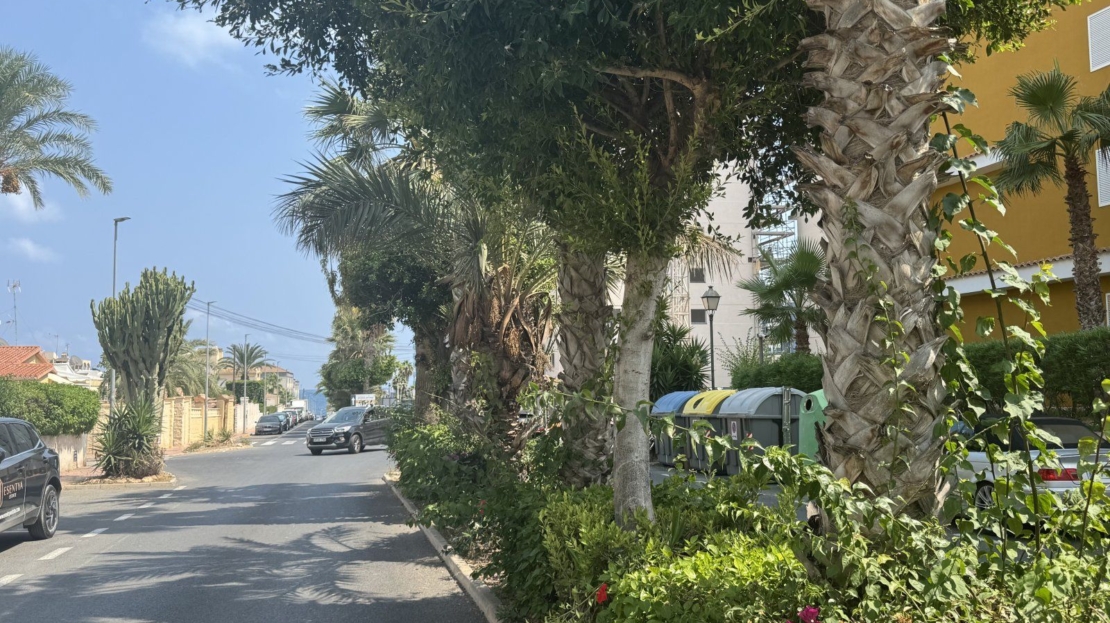 Endast 200 m från havet ligger denna ljusa takvåning på 6:e våningen med 110 m² och en inglasad terrass på 12 m² i söderläge. Den har 3 sovrum (ett med utgång till terrassen), 1 komplett badrum, 1 gästtoalett, vardagsrum/matsal med A/C och fläkt, samt ett renoverat öppet kök med diskmaskin, tvättmaskin och fönster. Bostaden har säkerhetsdörr, säljs möblerad och har hiss, gemensam pool och parkering.