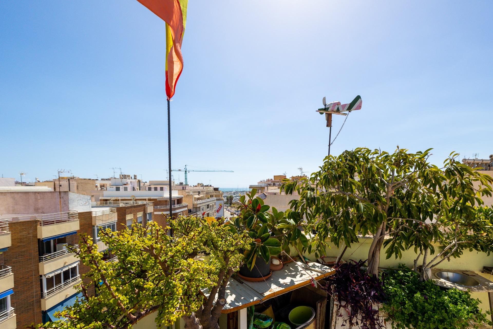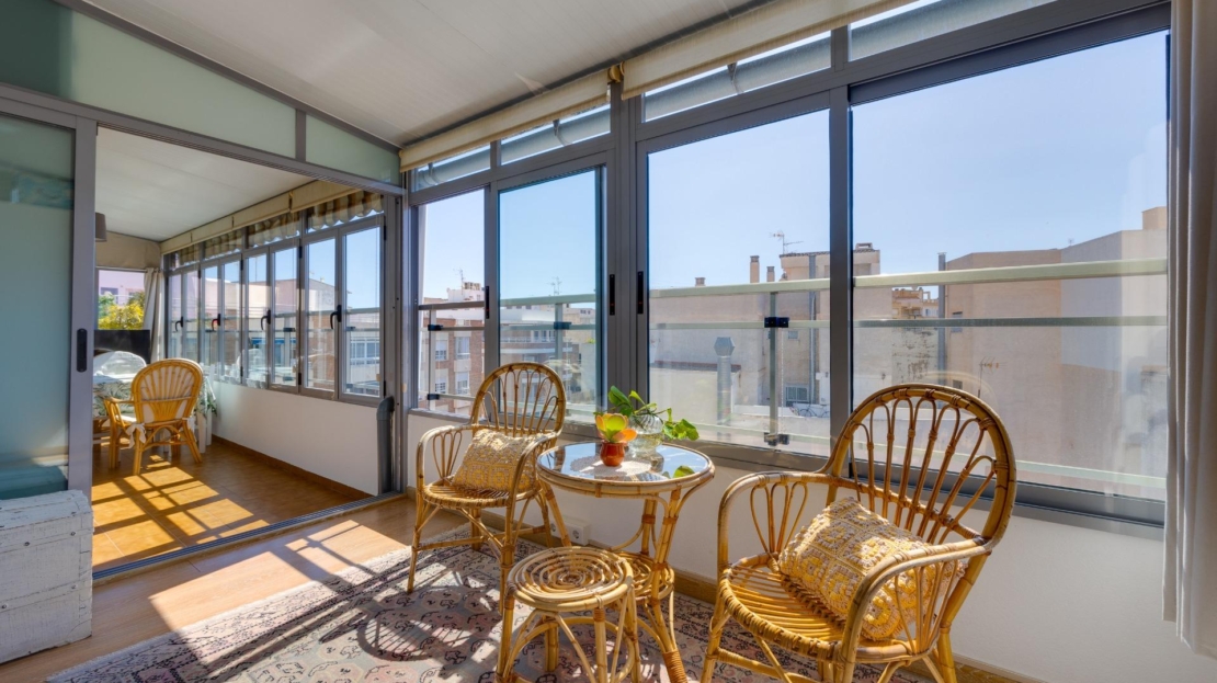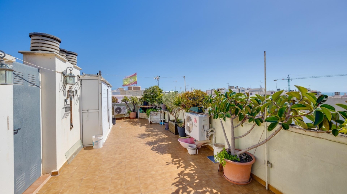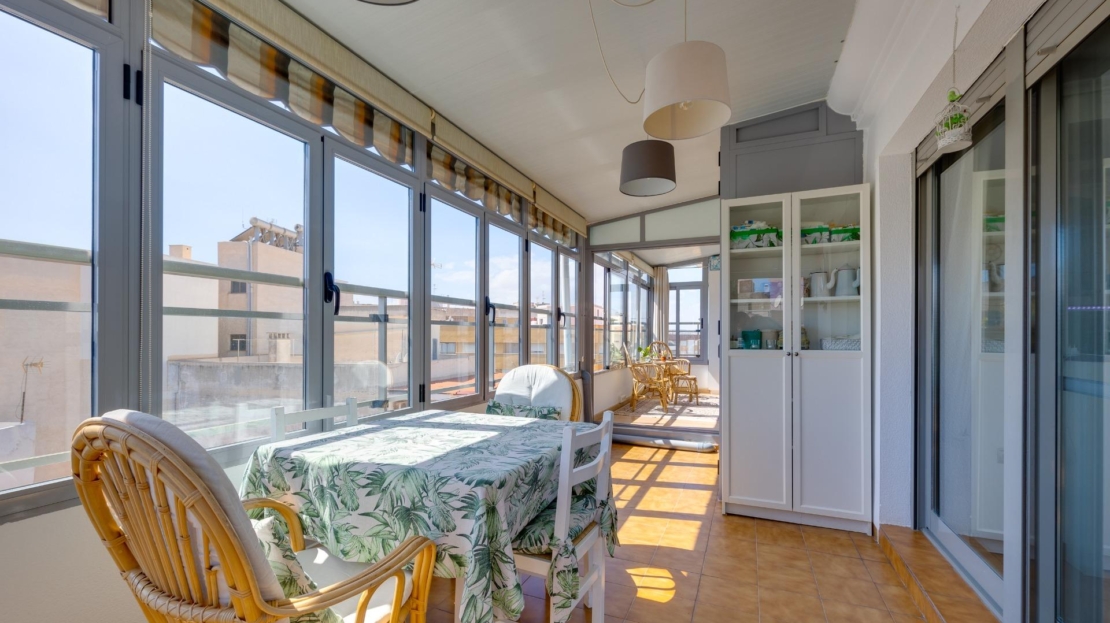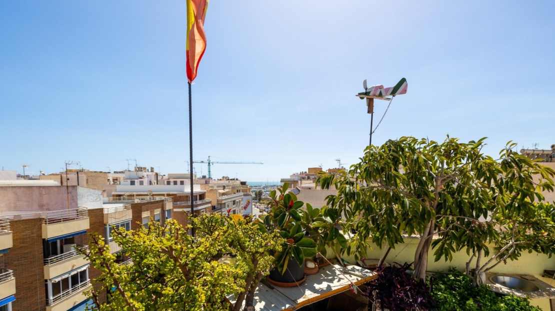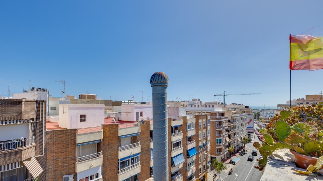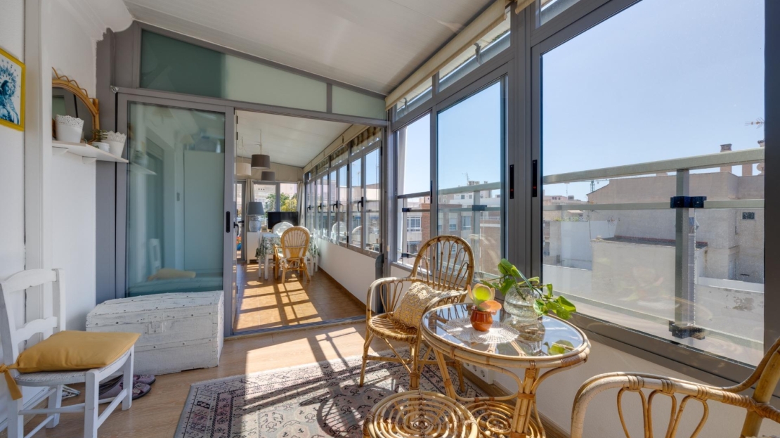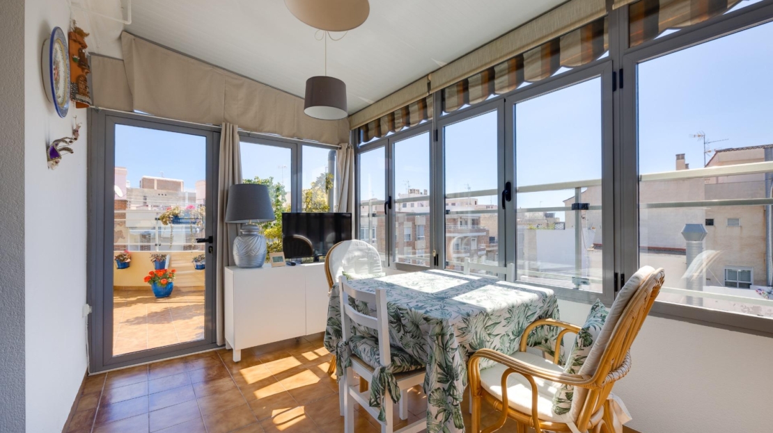 Denna vackra takvåning på femte våningen med hiss erbjuder ett strategiskt läge i centrala Torrevieja, bara några meter från restaurangen Las Cañas och omgiven av alla nödvändiga tjänster såsom restauranger, apotek, busshållplatser, stormarknader etc. Bostaden utmärker sig genom sin funktionalitet och sitt utmärkta utnyttjande av naturligt ljus tack vare sin dubbla orientering mot söder och öster. Interiören består av ett vardagsrum med matplats integrerat med ett öppet kök, två ljusa sovrum och ett fullt utrustat badrum med dusch. Vardagsrummet har direkt tillgång till en rymlig L-formad terrass som omger bostaden; detta utrymme är uppdelat i en inglasad del och en öppen del, vilket möjliggör användning året runt både praktiskt och för rekreation samtidigt som man kan njuta av fri utsikt och havsutsikt. Dessutom ingår ett privat solarium på övervåningen med fantastisk utsikt och en köksdel, vilket ger ett extra utomhusutrymme av stort värde för sammankomster med vänner eller familj. Missa inte takvåningen du alltid har drömt om. Kontakta oss nu och kom och upptäck din nästa terrass med havsutsikt!
