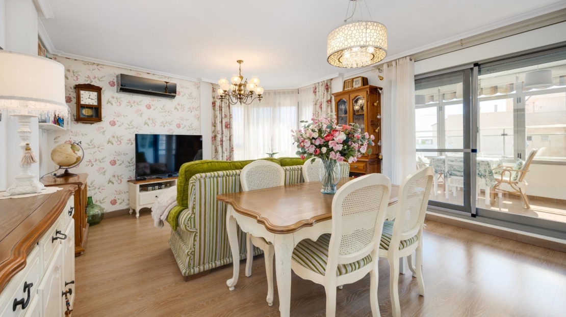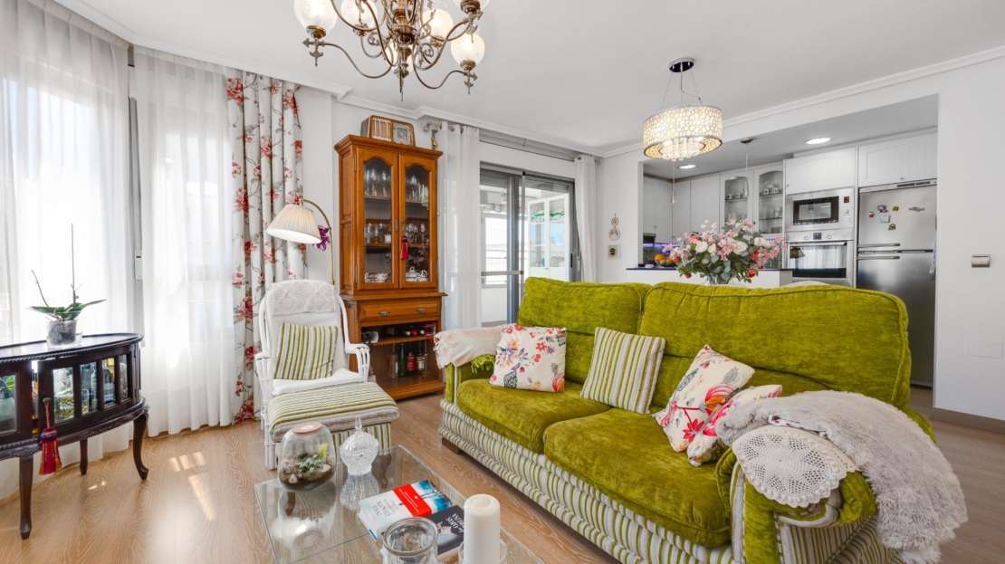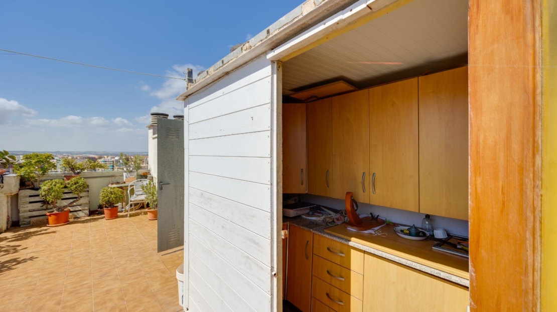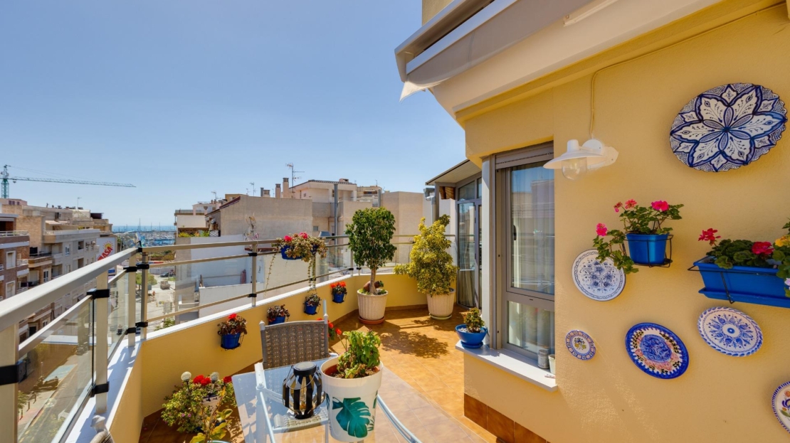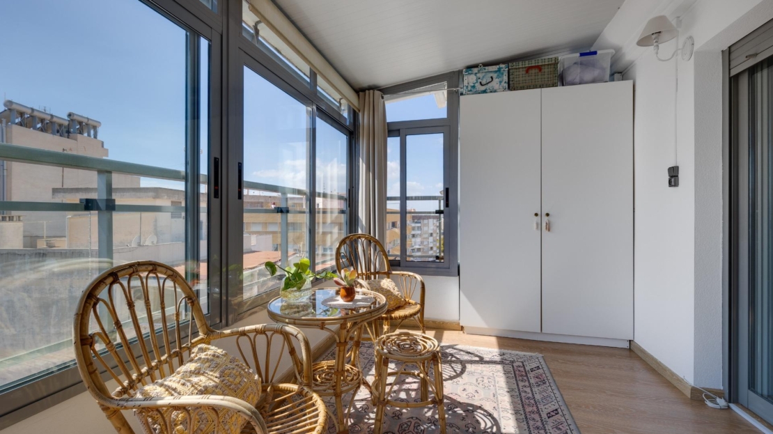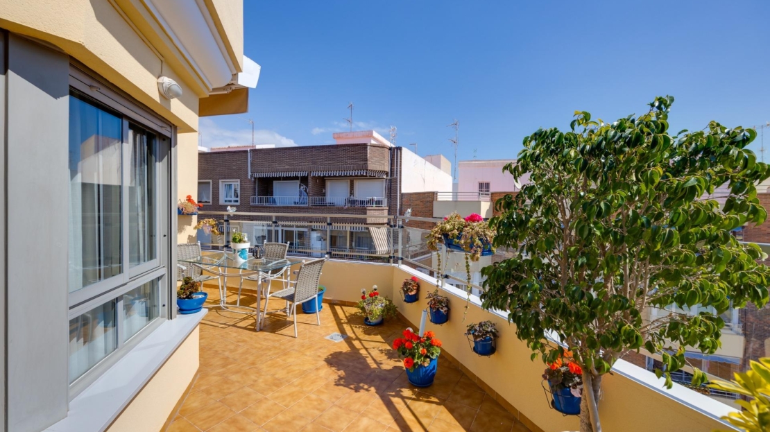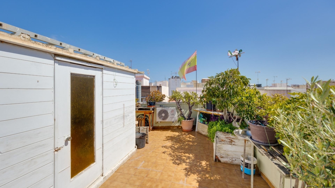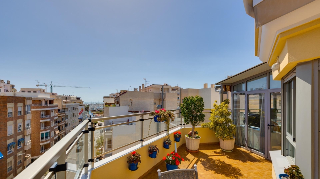 Denna vackra takvåning på femte våningen med hiss erbjuder ett strategiskt läge i centrala Torrevieja, bara några meter från restaurangen Las Cañas och omgiven av alla nödvändiga tjänster såsom restauranger, apotek, busshållplatser, stormarknader etc. Bostaden utmärker sig genom sin funktionalitet och sitt utmärkta utnyttjande av naturligt ljus tack vare sin dubbla orientering mot söder och öster. Interiören består av ett vardagsrum med matplats integrerat med ett öppet kök, två ljusa sovrum och ett fullt utrustat badrum med dusch. Vardagsrummet har direkt tillgång till en rymlig L-formad terrass som omger bostaden; detta utrymme är uppdelat i en inglasad del och en öppen del, vilket möjliggör användning året runt både praktiskt och för rekreation samtidigt som man kan njuta av fri utsikt och havsutsikt. Dessutom ingår ett privat solarium på övervåningen med fantastisk utsikt och en köksdel, vilket ger ett extra utomhusutrymme av stort värde för sammankomster med vänner eller familj. Missa inte takvåningen du alltid har drömt om. Kontakta oss nu och kom och upptäck din nästa terrass med havsutsikt!