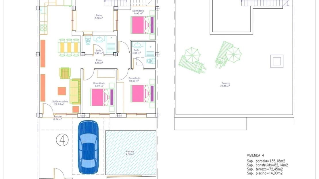 Alla hus är byggda i en våning och har utformats för att kunna njuta av solsken året om. Varje fastighet har en terrass på framsidan, en privat uteplats på baksidan och ett rymligt solarium på taket, vilket skapar flera utomhusområden för avkoppling och umgänge. Den privata trädgården har en pool och parkering på tomten, vilket garanterar komfort och avskildhet för alla husägare.