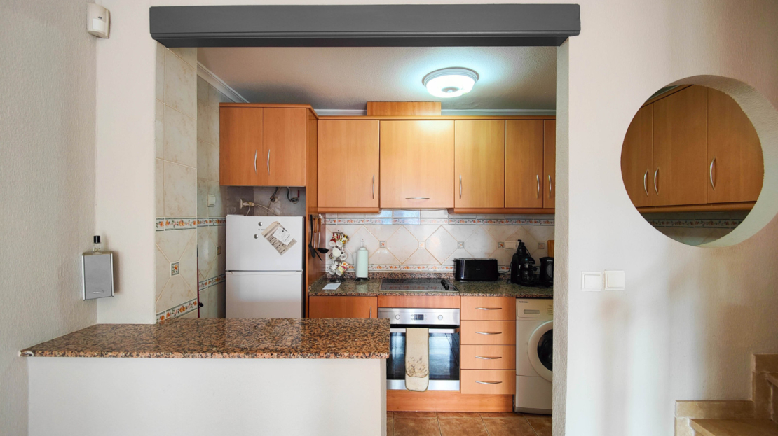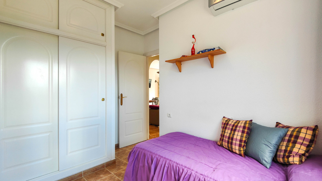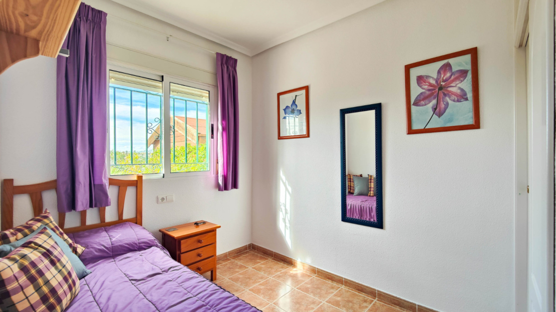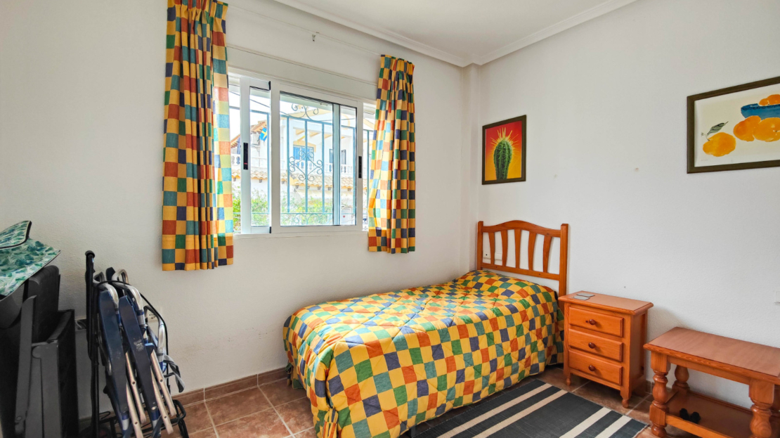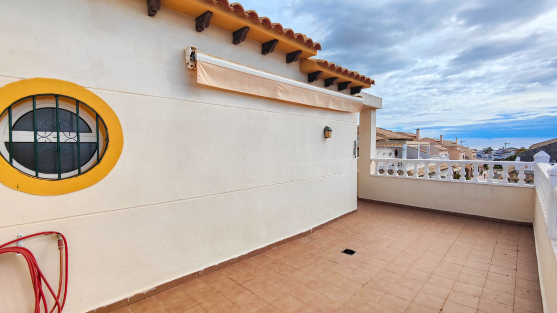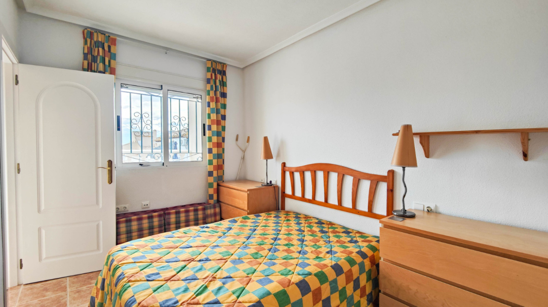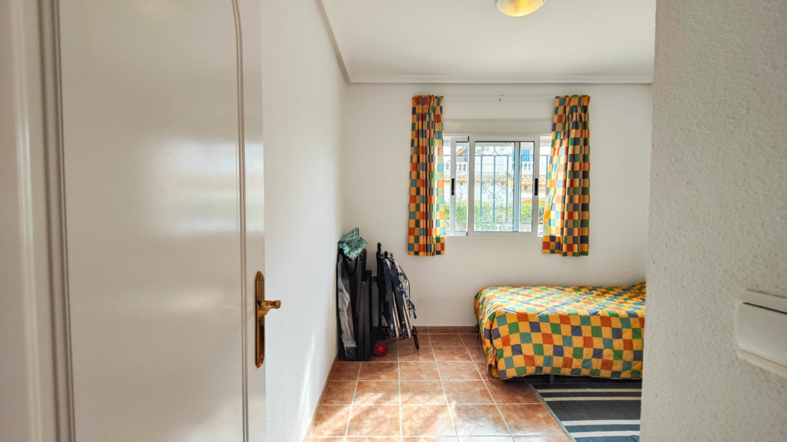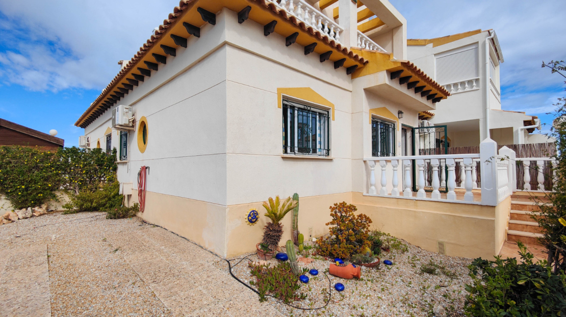 Fantástica vivienda adosada en esquina en Punta Prima, Orihuela Costa, ubicada en una zona tranquila junto a una agradable zona verde y a pocos minutos de todos los servicios y playas.La propiedad destaca por su excelente orientación suroeste, lo que garantiza sol durante gran parte del día, así como por su parcela privada de aproximadamente 90 m² con entrada para coche y un jardín con gran privacidad.Dispone de 3 dormitorios y 2 baños, distribuidos de la siguiente manera:Planta baja:Luminoso salón-comedorCocina equipada2 dormitorios1 baño completoPlanta alta:Dormitorio principalBaño en suiteUn punto muy positivo es la comodidad de contar con dormitorios y un baño completo en la planta baja, ideal para familias, personas mayores o invitados.La vivienda se vende amueblada y equipada, cuenta con aire acondicionado en uno de los dormitorios, y se encuentra en muy buen estado general.En la parte superior encontramos un amplio solárium con vistas a la zona verde y ligeras vistas al mar, perfecto para disfrutar del clima mediterráneo.La urbanización ofrece piscina comunitaria y se ubica cerca de supermercados, restaurantes, bares, centros comerciales y todos los servicios necesarios.Una oportunidad ideal tanto como residencia habitual, segunda vivienda o inversión.