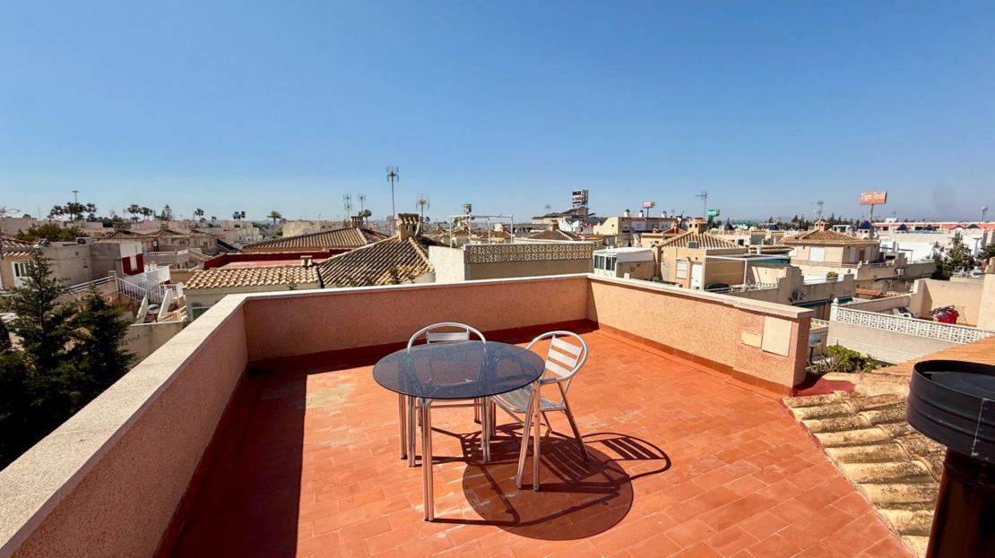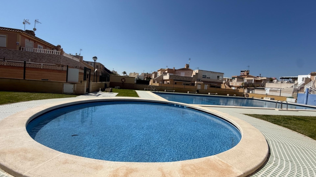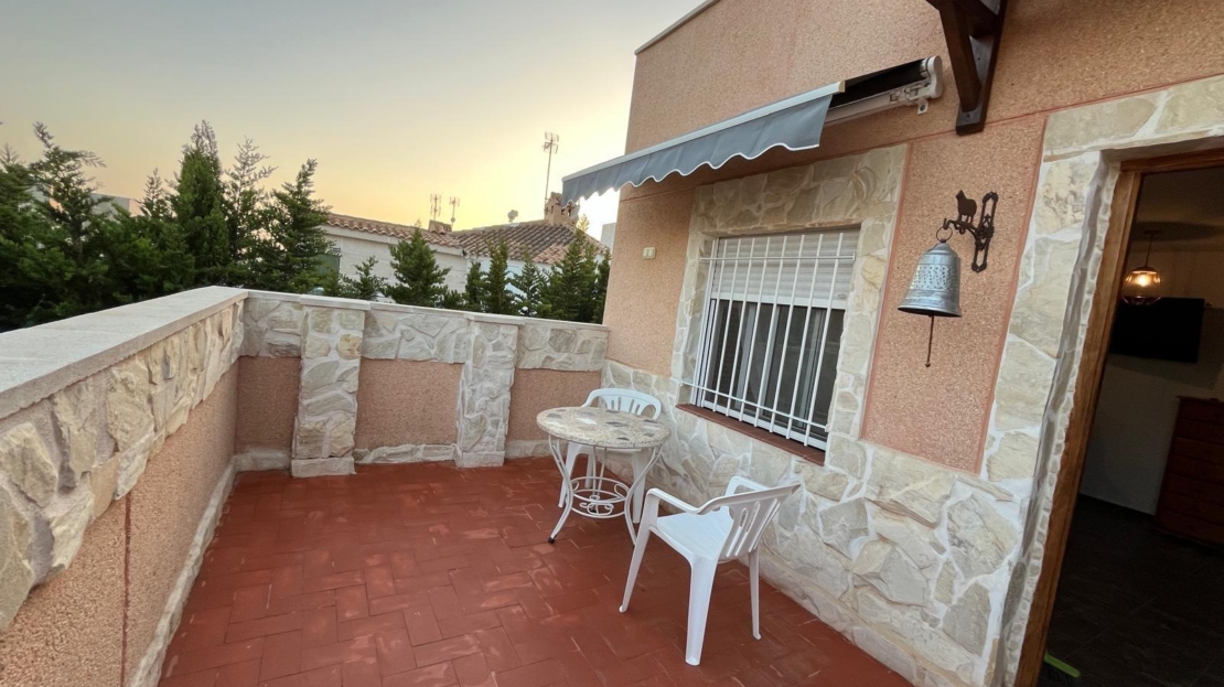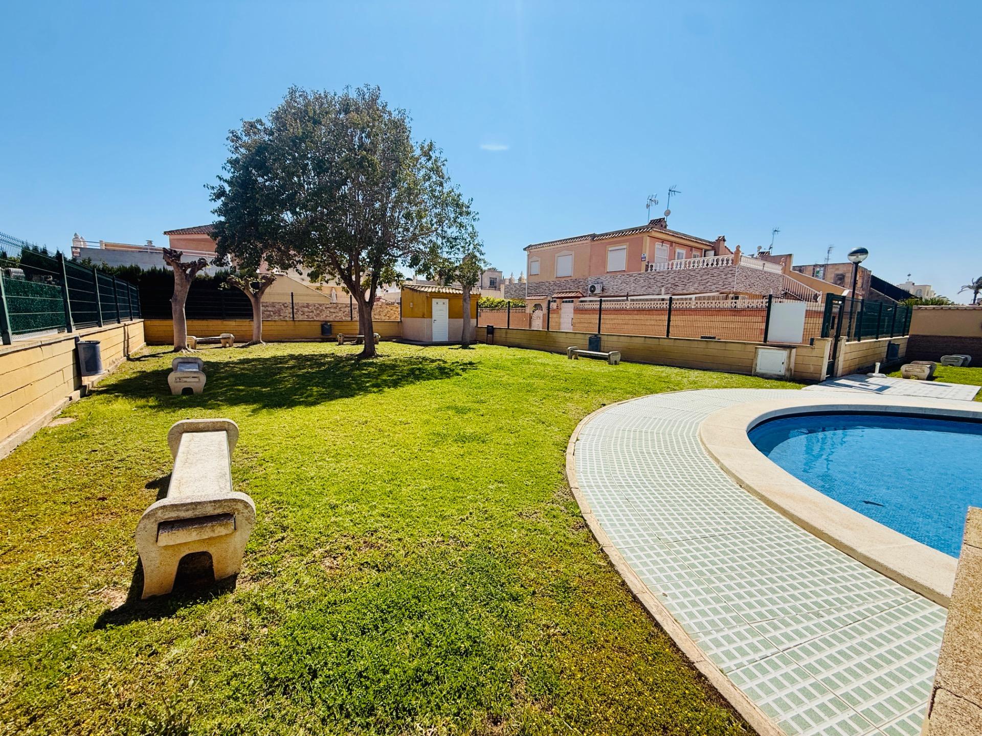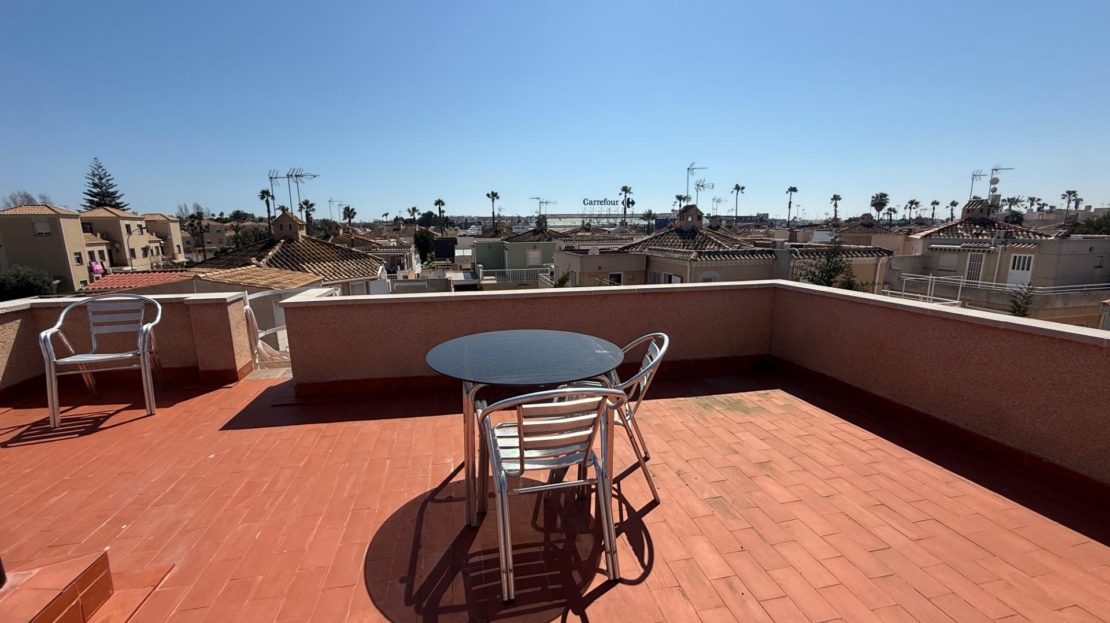 NEW LISTING! RENOVATED TOWNHOUSE FOR SALE WITH TOURIST LICENSE AND COMMUNAL POOL IN TORREVIEJA NOW ON SALE! Beautiful renovated townhouse with TOURIST LICENSE and COMMUNAL POOL located in the Aquapark residential complex, in the Doña Inés area of Torrevieja. The property is ready to move into, fully renovated and furnished, and its layout is as follows: On the ground floor, there are two modern bedrooms, an open-plan kitchen, a living-dining room, and a bathroom with a shower. Outside, there is a spacious patio with surrounding trees, approximately 47 square meters. A storage room with additional storage space is also located in this area. The upper floor, with independent access via an external staircase, consists of a lovely independent loft with an open-plan kitchen, a sleeping area with a double bed and sofa, a bathroom, and a large terrace with a barbecue, as well as a laundry room. Likewise, the rooftop features a private solarium of approximately 30 square meters with unobstructed panoramic views. The residential complex boasts a large communal swimming pool surrounded by green areas. It is very close to all amenities and just steps from the Habaneras shopping center and the Ozone leisure area. Nearby you’ll find bars, shops, schools, pharmacies, and more. This is an excellent opportunity both for those looking to live here and for those wishing to maximize their investment on the Costa Blanca, thanks to its features and tourist license. Contact us and come visit!