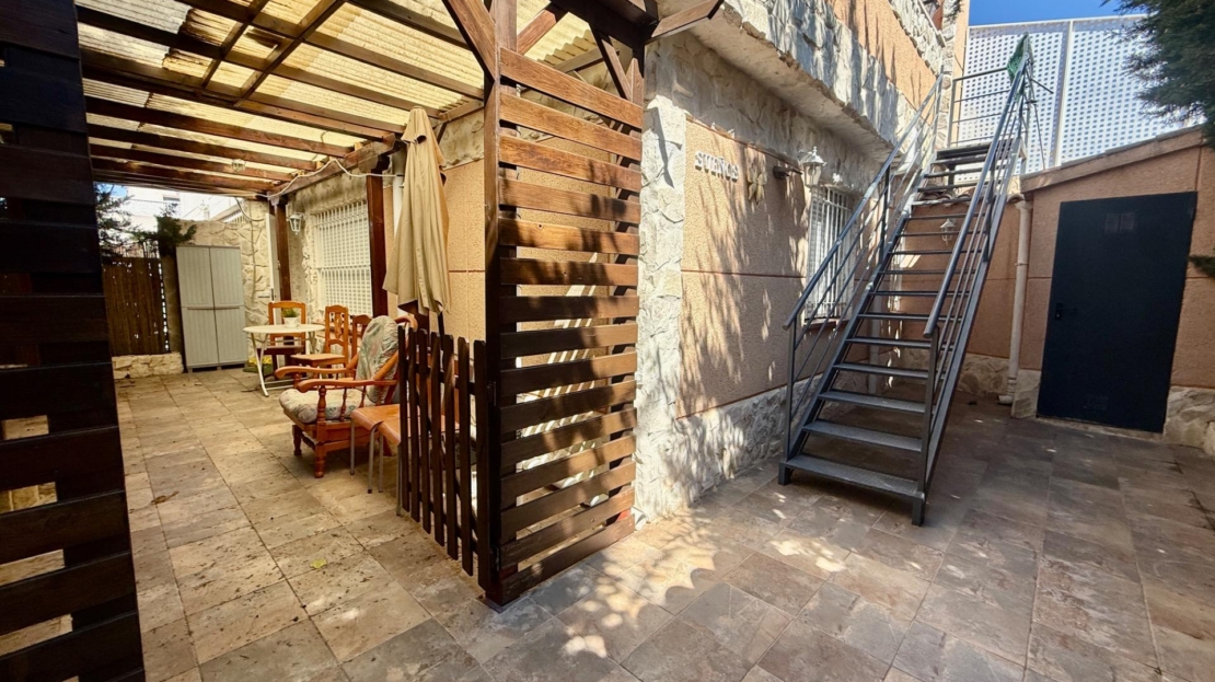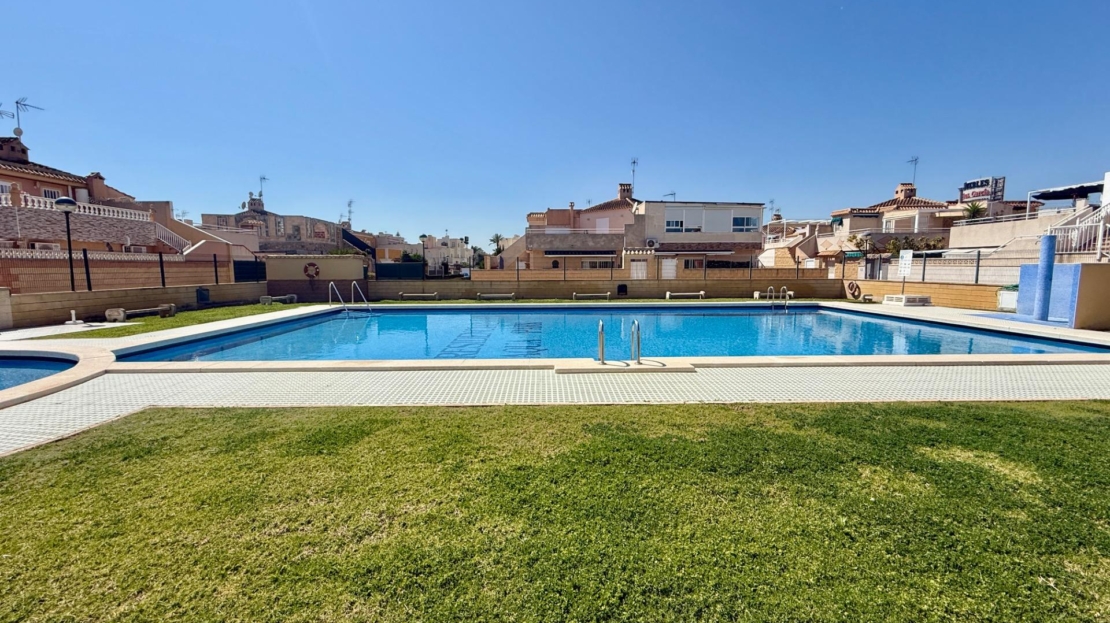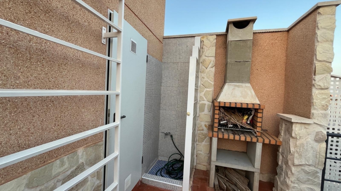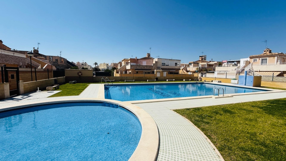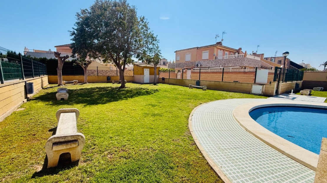 NEW LISTING! RENOVATED TOWNHOUSE FOR SALE WITH TOURIST LICENSE AND COMMUNAL POOL IN TORREVIEJA NOW ON SALE! Beautiful renovated townhouse with TOURIST LICENSE and COMMUNAL POOL located in the Aquapark residential complex, in the Doña Inés area of Torrevieja. The property is ready to move into, fully renovated and furnished, and its layout is as follows: On the ground floor, there are two modern bedrooms, an open-plan kitchen, a living-dining room, and a bathroom with a shower. Outside, there is a spacious patio with surrounding trees, approximately 47 square meters. A storage room with additional storage space is also located in this area. The upper floor, with independent access via an external staircase, consists of a lovely independent loft with an open-plan kitchen, a sleeping area with a double bed and sofa, a bathroom, and a large terrace with a barbecue, as well as a laundry room. Likewise, the rooftop features a private solarium of approximately 30 square meters with unobstructed panoramic views. The residential complex boasts a large communal swimming pool surrounded by green areas. It is very close to all amenities and just steps from the Habaneras shopping center and the Ozone leisure area. Nearby you’ll find bars, shops, schools, pharmacies, and more. This is an excellent opportunity both for those looking to live here and for those wishing to maximize their investment on the Costa Blanca, thanks to its features and tourist license. Contact us and come visit!