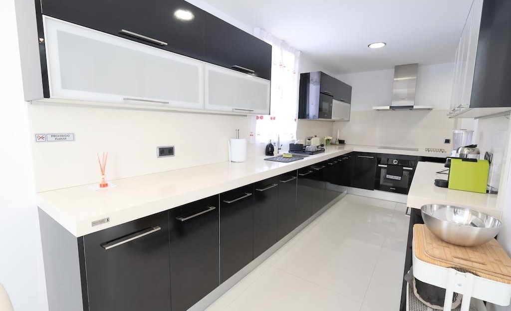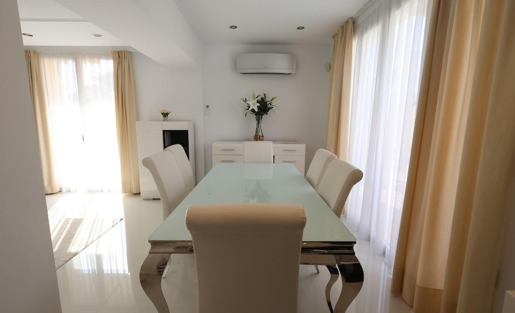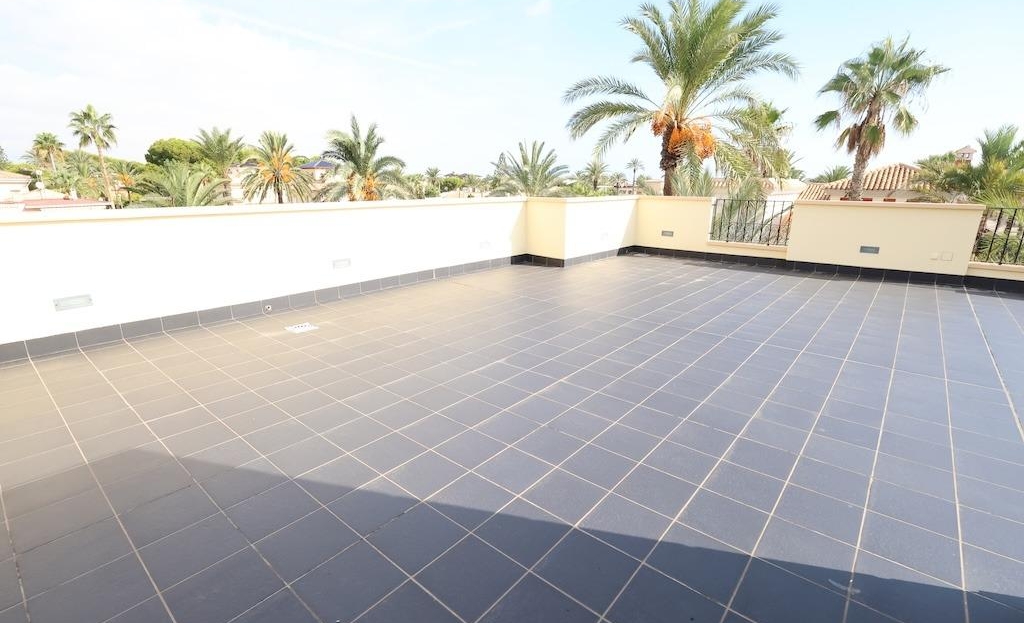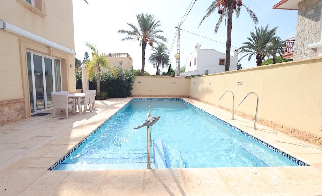 Cabo Roig Detached villa on a 415 m2 corner plot overlooking two streets.This modern, two-story home offers a contemporary and functional design, measuring 222 m2. It features 4 spacious bedrooms and 3 bathrooms, a bright living-dining room with a semi-integrated kitchen, a private pool, a driveway, and a large private solarium, perfect for enjoying the sun year-round.Sold fully furnished and equipped with air conditioning. Located in one of the most exclusive areas of the coast.