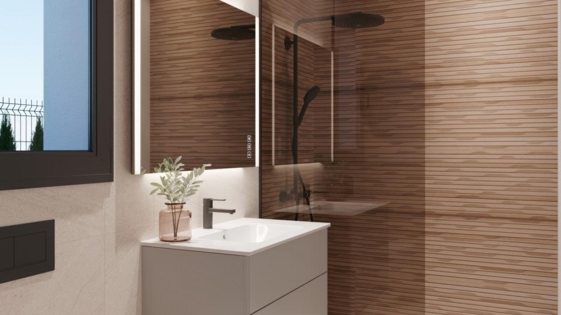 Bostadsområdet består av 17 villor på tomter från 300 m2. Du kan välja mellan bostäder med 2 eller 3 sovrum och 2 kompletta badrum på en våning, samt en terrass med privat pool på 6×2,4 och ett privat solarium på taket.