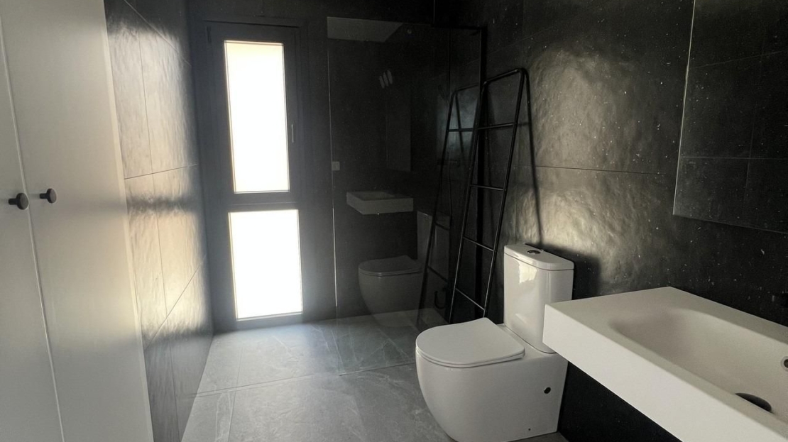 Första kvaliteter: interiör snickeri i trä och vitlackerade laminat, exteriör snickeri i antracitgrå pvc med dubbelglas och köldbrygga och automatiska persienner med aluminiumlameller, keramiska golv av 1: a kvalitet halkfri, släta väggar, säkerhetsdörr med 5 förankringspunkter, stora inbyggda garderober.