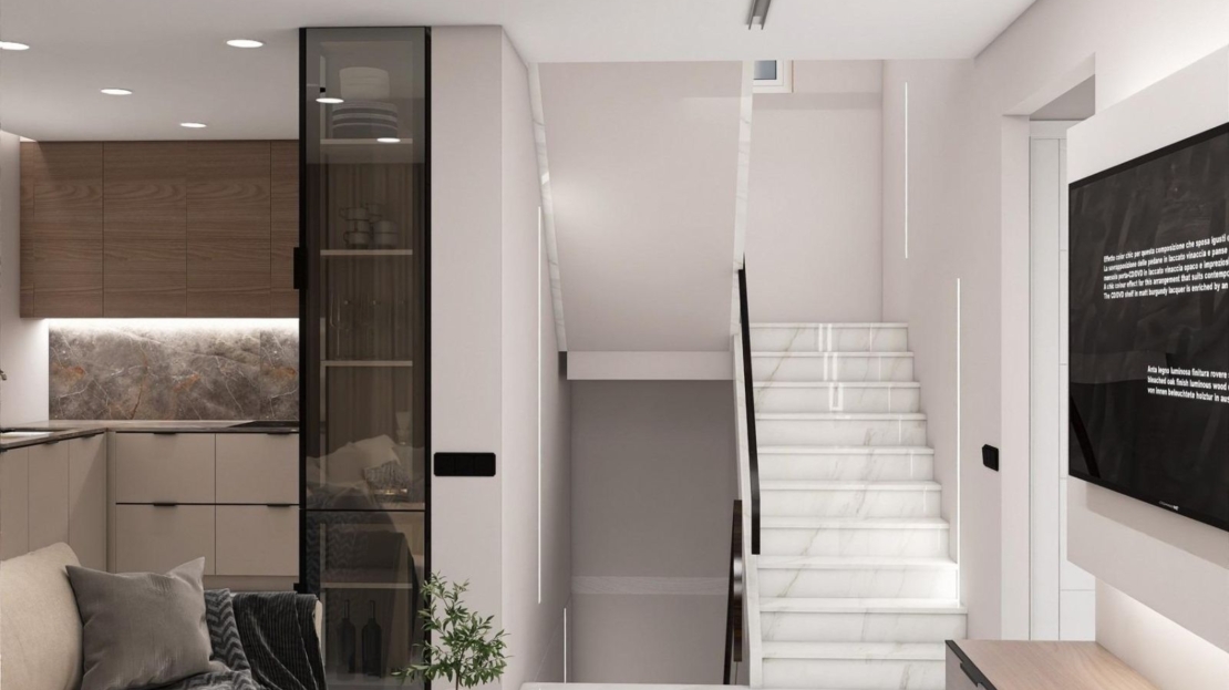 På bottenvåningen i huset hittar du ett garage, ett fritidsrum och ett fullt utrustat badrum. På första våningen i huset hittar du ett vardagsrum, ett kök i amerikansk stil fullt utrustat med högkvalitativa apparater, två sovrum med inbyggda garderober och en terrass med underbar utsikt. På husets översta våning, det stora sovrummet med två terrasser och ett fullt utrustat badrum.