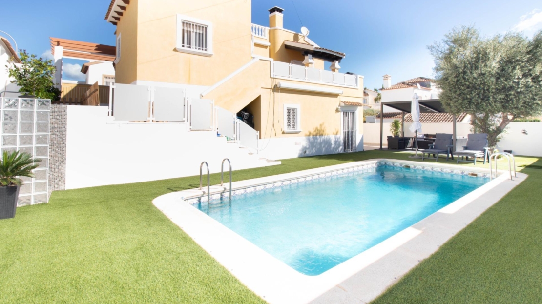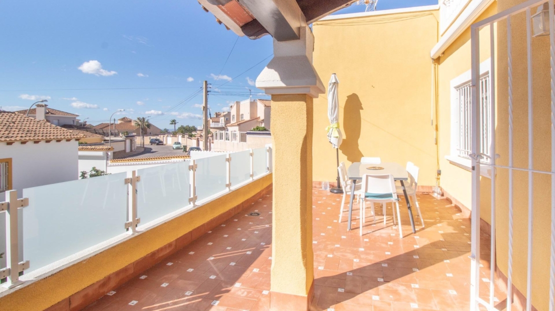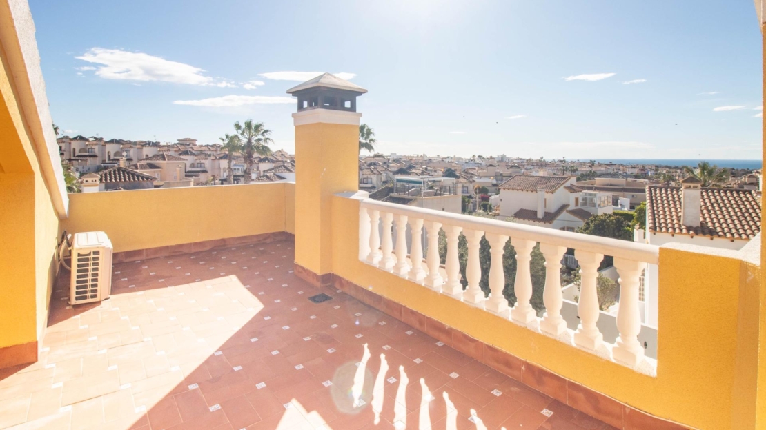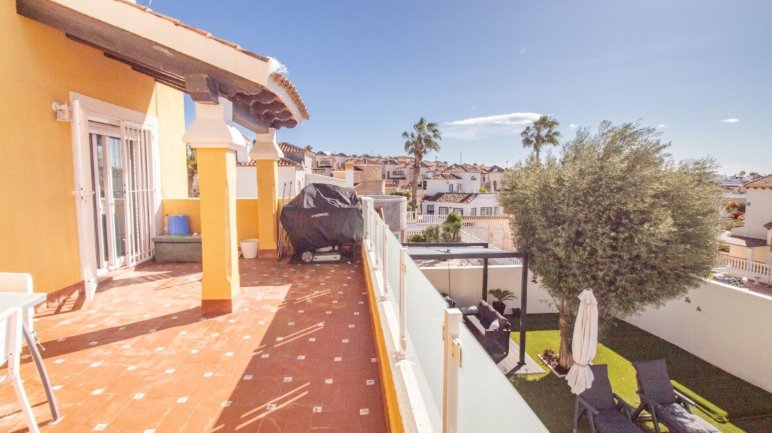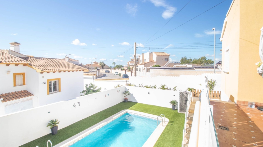 Os presentamos esta fantástica villa independiente con piscina privada en El Galán, San Miguel de Salinas.~La villa se distribuye en 2 plantas y solárium. Cuenta con 3 amplios dormitorios en la misma planta, 2 baños completos, uno en suite, y aseo, cocina independiente totalmente equipada. Zona de comedor y salón con chimenea, desde el salón se sale a una bonita terraza orientada al sur desde donde se ve el mar.~Tiene mucho espacio al aire libre, 2 terrazas, solárium y parcela de 309 metros cuadrados. ~~La villa dispone de zona de aparcamiento, trastero y placas solares. La zona exterior es totalmente independiente, con zona chill out con un olivo y la piscina privada. También tiene una zona de arboles frutales típicos mediterráneos como naranjo y limonero.