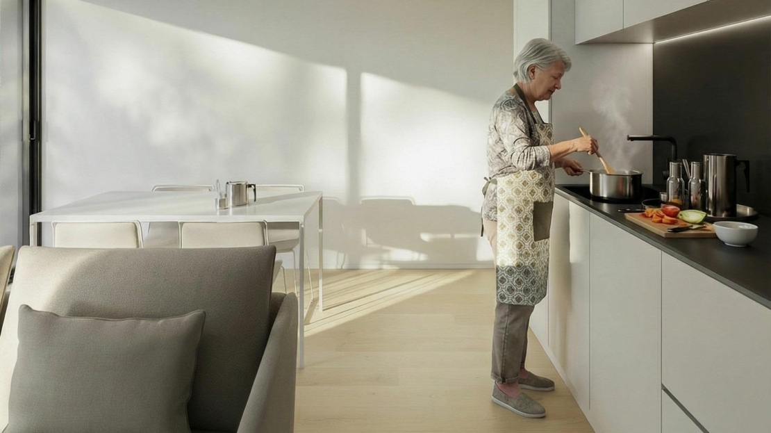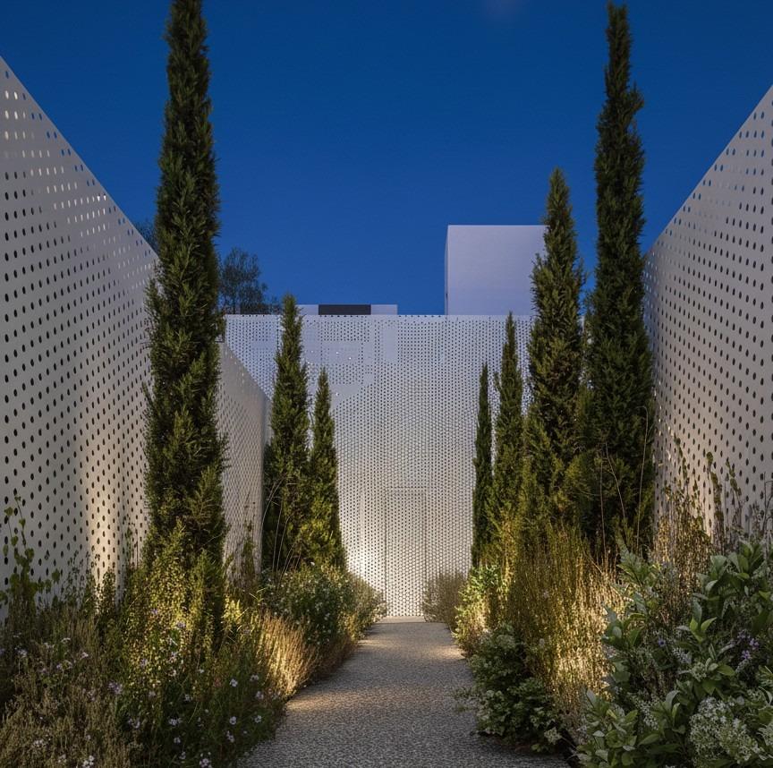 Bostadsområdet är fördelat på två nivåer för att anpassa sig naturligt till terrängen. Den övre nivån är helt dedikerad till bostäderna och de anlagda gemensamma utrymmena, vilket skapar en säker och lugn miljö för fotgängare. Den nedre nivån rymmer parkeringsplatser, förråd och tekniska utrymmen, diskret integrerade i designen. Denna separation garanterar avskildhet, lugn och en bilfri boendeupplevelse inom bostadsområdet.