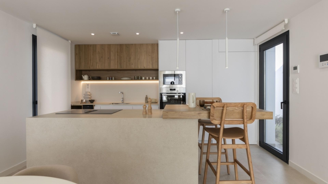 Dessa villor är byggda med högkvalitativa material och moderna byggtekniker för att säkerställa komfort och energieffektivitet. Funktionerna inkluderar en förstärkt säkerhetsdörr, fullt utrustat kök med vitvaror, golvvärme i badrummen och LED-belysning i interiören.