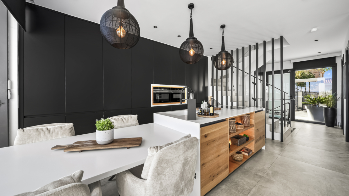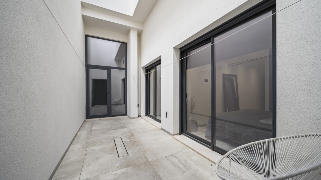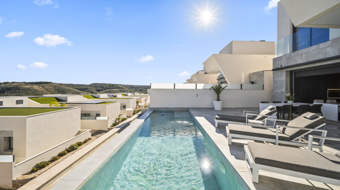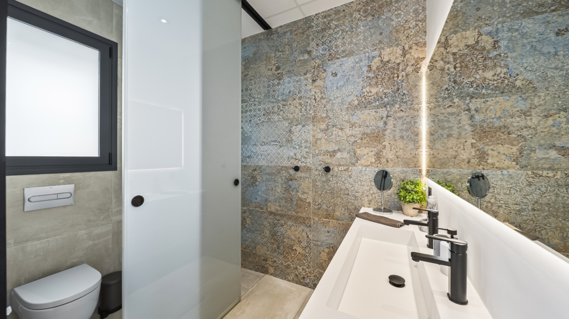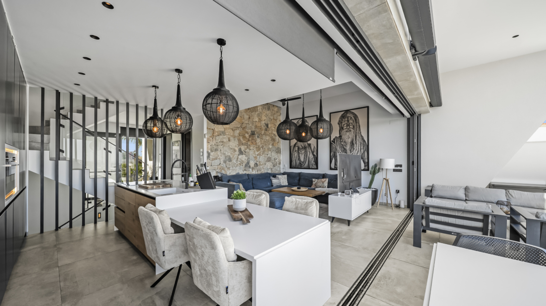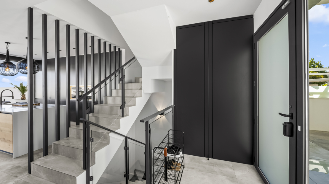 På entréplan välkomnas du av ett modernt kök som smidigt övergår i det ljusa vardagsrummet. Härifrån har du direkt access till den generösa uteplatsen, där du kan njuta av härliga grillkvällar, koppla av i solen eller ta ett svalkande dopp i din privata saltvattenpool. På denna våning finns också ett sovrum med eget badrum samt en praktisk gästtoalett. För extra komfort har bostaden golvvärme i vardagsrummet, köket, entrén, gästtoaletten och samtliga badrum.