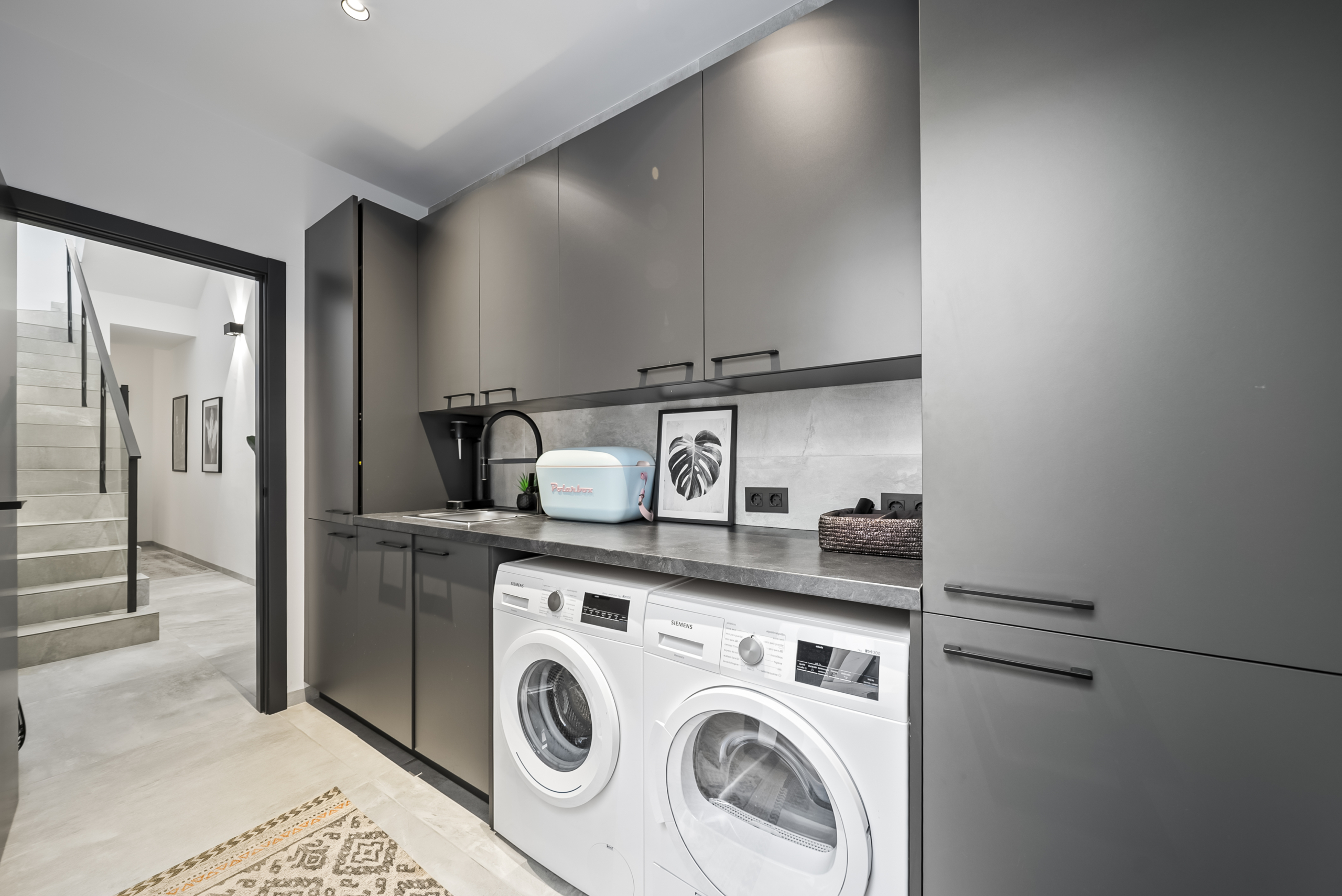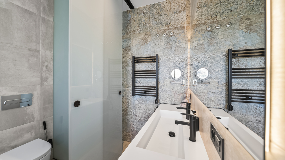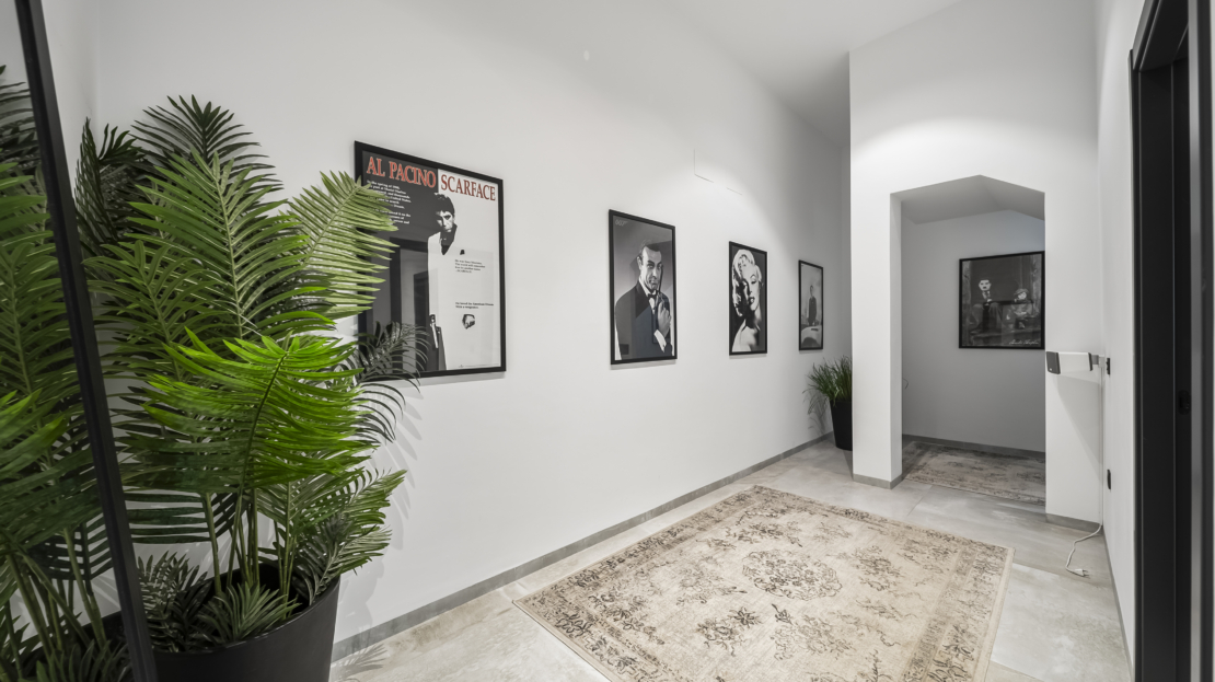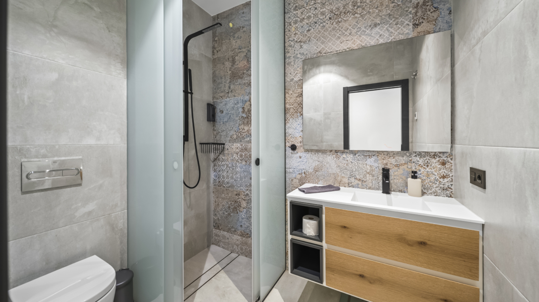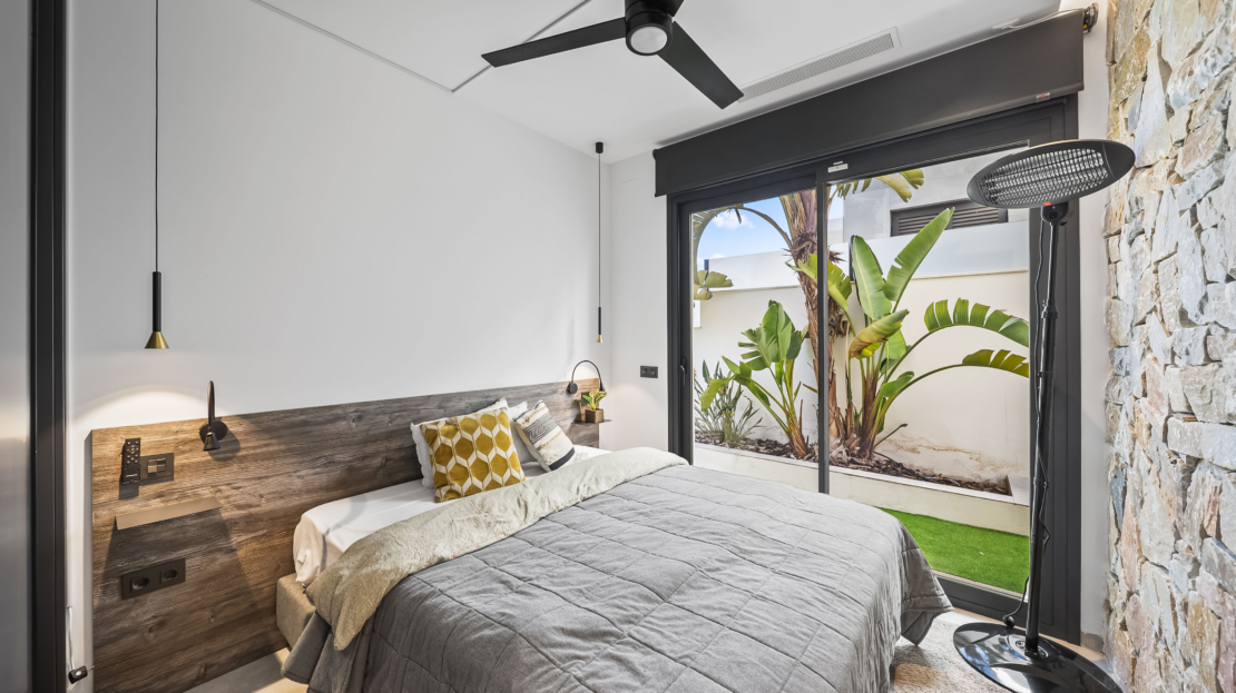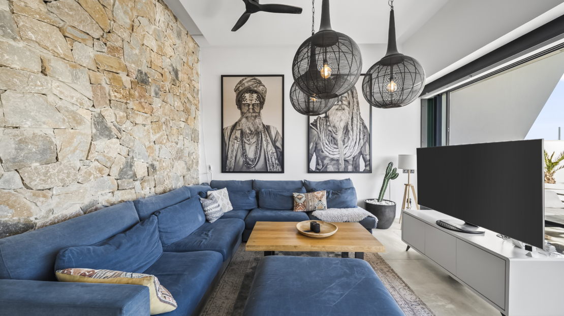 På entréplan välkomnas du av ett modernt kök som smidigt övergår i det ljusa vardagsrummet. Härifrån har du direkt access till den generösa uteplatsen, där du kan njuta av härliga grillkvällar, koppla av i solen eller ta ett svalkande dopp i din privata saltvattenpool. På denna våning finns också ett sovrum med eget badrum samt en praktisk gästtoalett. För extra komfort har bostaden golvvärme i vardagsrummet, köket, entrén, gästtoaletten och samtliga badrum.
