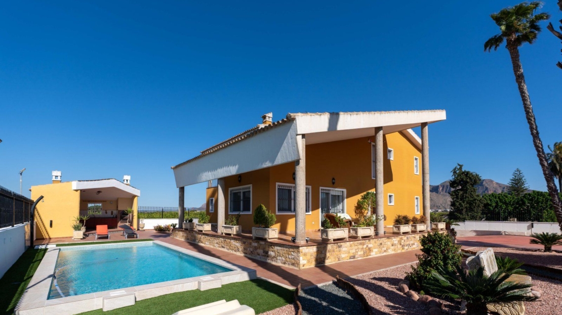 9,480 m2. fully fenced property with 495 m2. house built on a plot of 1,000 m2. all fenced within the perimeter of the property.The house is composed of three floors:- SEMI-BASEMENT FLOOR: 224 m2. Constructed Garage for several vehicles, gym with shower, entertainment area, DIY area with shelves and bench, a bedroom, and a dressing room-shoe closet.- GROUND FLOOR: 178 m2. Constructed Distributed in large living room, large kitchen with access to an outdoor barbecue area, separate pantry, laundry area with access to an outdoor terrace, 1 bathroom with shower, 1 bedroom with built-in closet and an office-room with access to an outdoor terrace.- SECOND FLOOR: 93 m2. Constructed Distributed in a lookout area to the living room downstairs, master bedroom with balcony, bathroom with whirlpool tub and dressing room, 2 more bedrooms (one with built-in closet) and an extra bathroom with bathtub.AMENITIES Central heating with boiler with water radiators and air conditioning ducts both throughout the house. Outdoor shed with air conditioning engines, heating boiler and gas-oil tank for maintenance. Grilles on all doors and windows with mosquito nets. Installation of Fiber Optic Internet. Building with access from the kitchen for a barbecue area with sink and oven. Swimming pool and garden with outdoors lighting. Access gates to the property and garage with motorized doors. The house is surrounded with a planted land with lemon verna in production and with traditional method of irrigation. This villa also provides an annual return as it has lemon verna in production with traditional irrigation, which provides an annual income of between 15,000 – 20,000 euros depending upon the weather and lemon production.PROPERTY LOCATION The property is in a quiet area, 5 minutes from the Carrefour shopping center and town center of Orihuela and Bigastro with good access by road and well connected to both towns. The house is surrounded by residential homes of similar characteristics, and it has an easy access by road and in its surroundings where you can find supermarkets, restaurants, and all necessary services.M. Ext. Aluminum – M. Int. Wood Hot water boiler Equipped independent kitchen. Monolayer facade Rustic floor Southeast facing