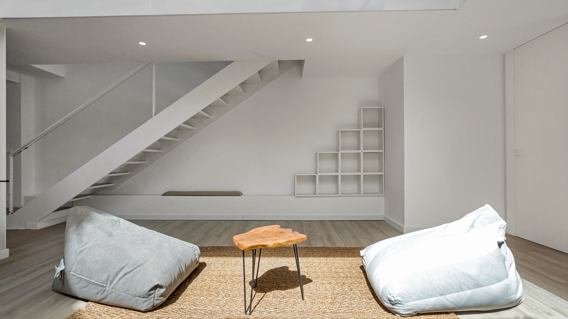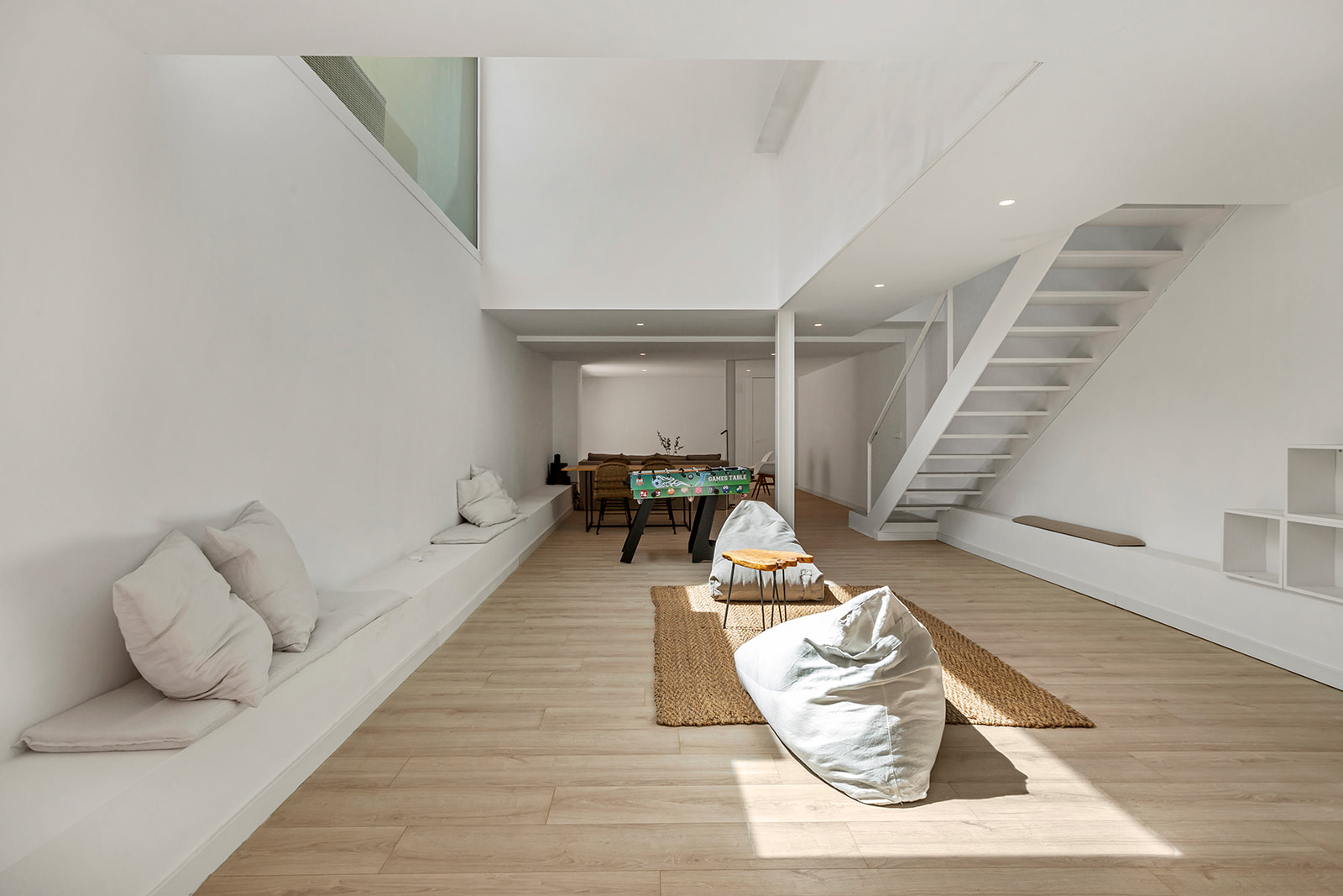 Källare med spelrum, arbetsyta och TV-del