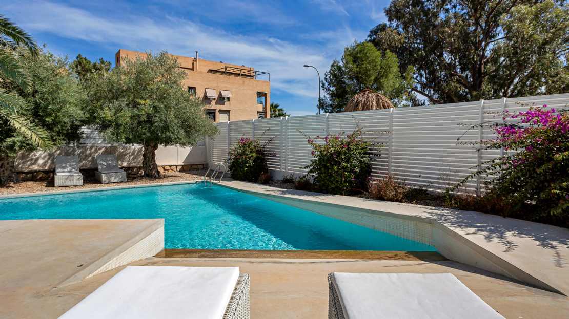 Fristående bostad byggd 2019 på en tomt på 830 m², belägen i ett lugnt bostadsområde endast 200 meter från Muchavista-stranden. Bostaden erbjuder rymliga utrymmen med modern design, vardagsrum med öppen spis och alla sovrum med fönster mot utsidan. Den har 4 sovrum och 4 badrum samt en källare med spelrum, arbetsyta och TV-del. Utomhus finns privat pool, grillplats, trädgård och veranda. Nära service, transport och endast 15 minuter med bil till Alicante.