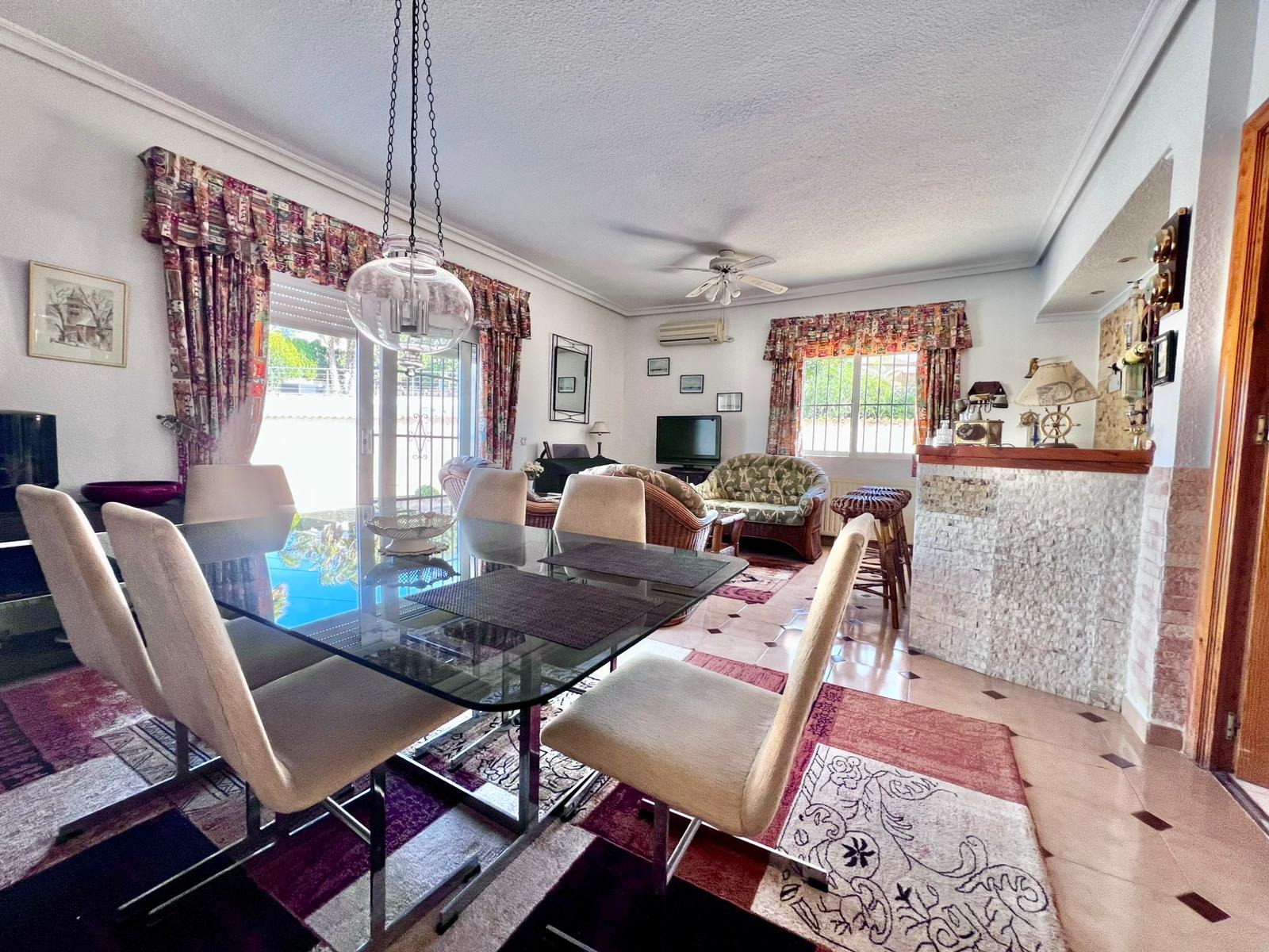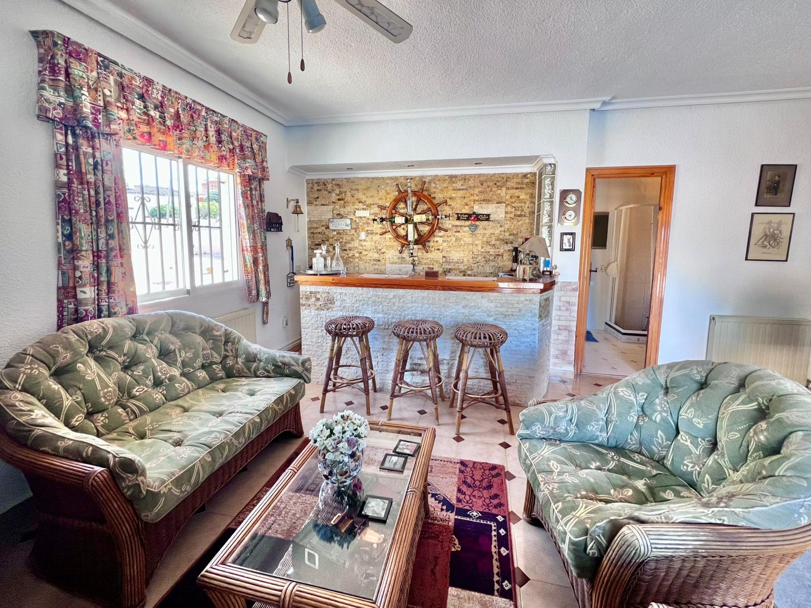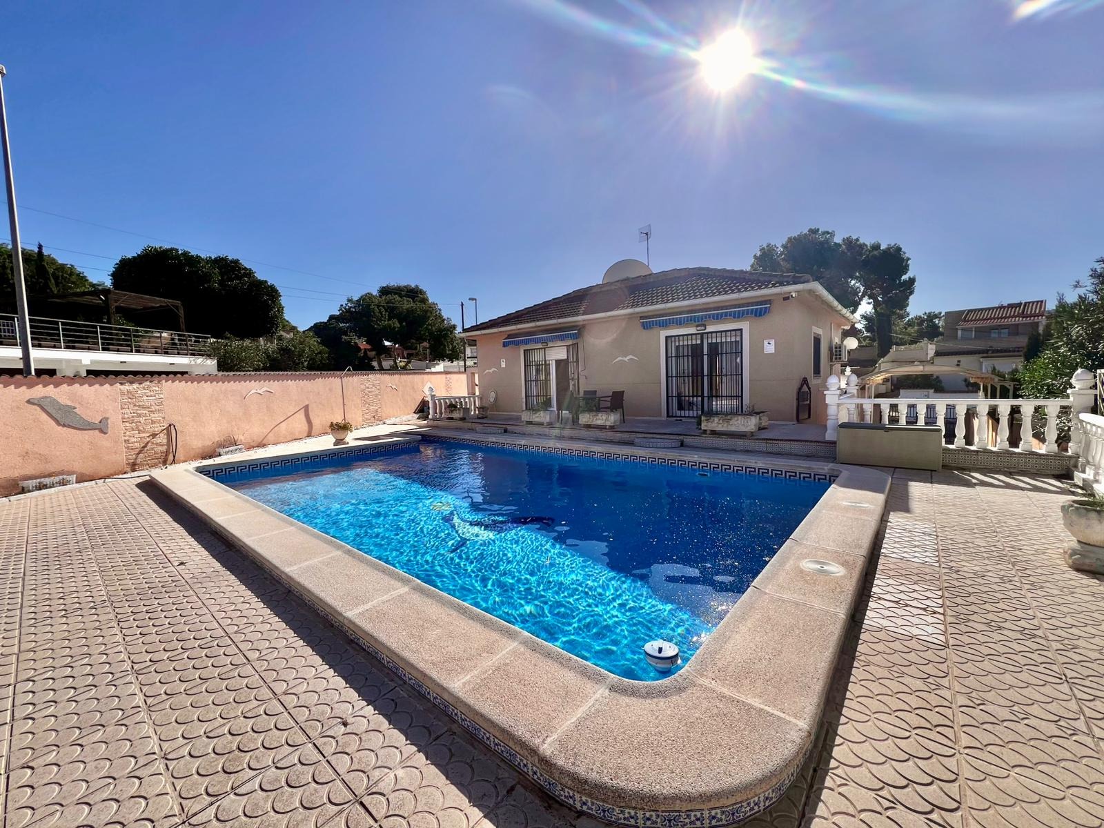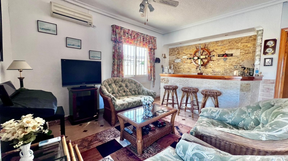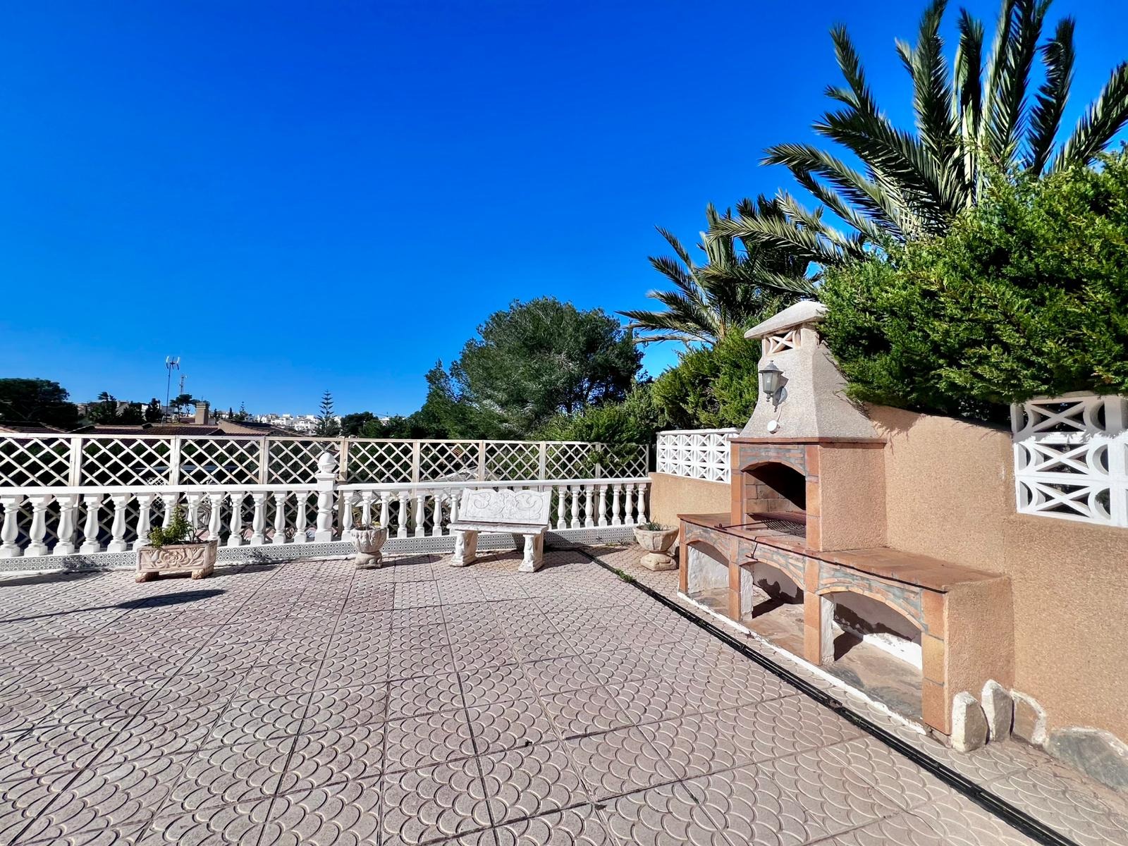 Espectacular villa independiente de 144 m2 construidos sobre una amplia parcela en esquina de 800 m2, perfecta para disfrutar de privacidad, espacio exterior y el mejor clima mediterráneo.~~La vivienda dispone de 2 dormitorios y 2 baños, con la ventaja de que los dormitorios son de gran tamaño, ofreciendo la posibilidad de crear más habitaciones según necesidades. Cuenta con dos amplios salones con chimenea, ideales para el confort en cualquier época del año, además de cocina independiente totalmente funcional.~~En el exterior encontrarás un acogedor porche, piscina privada, zona de barbacoa y amplias áreas para ocio o jardín. También incluye garaje en sótano y aire acondicionado.~~Sobre la zona: Los Balcones es una de las áreas residenciales más demandadas de Torrevieja, tranquila y bien comunicada, cercana a servicios, hospitales, supermercados y a pocos minutos de las playas y del centro comercial Zenia Boulevard.~~Una propiedad con muchísimo potencial, ideal tanto como residencia habitual como inversión.