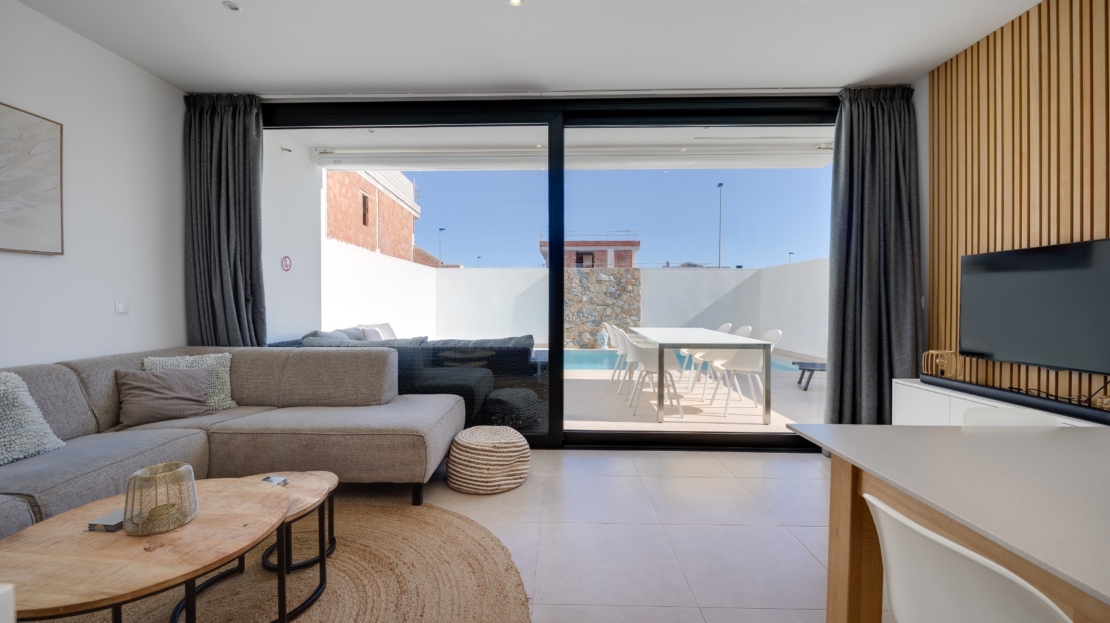 Bienvenido a esta fresca y moderna casa en Santiago de la Ribera, a sólo 1000 metros del mar y cerca de todos los servicios. Con una superficie total de 158 m², piscina privada y una soleada orientación sur, aquí lo tiene todo para disfrutar al máximo de la vida al aire libre. Luz, tranquilidad y confort se unen aquí. Ideal como segunda residencia, lugar de vacaciones o un buen hogar bajo el sol de España.INTERIOR:- 3 dormitorios y 2 baños- Cocina abierta totalmente equipada- Aire acondicionado- Doble acristalamiento- Recientemente pintado (interior y exterior, 2023)- Listo para entrar a vivir. En excelente estado EXTERIOR:- Dos amplias terrazas: en la planta baja y en la primera planta- Piscina privada: refrésquese o tome el sol en casa.- Orientación sur. Máxima luz solar, ideal para vivir al aire libre- Trastero adicional detrás de la casa- Amplio aparcamiento en las inmediacionesINFORMACIÓN ADICIONAL:- Año de construcción: 2016- Impuestos municipales (IBI): aprox. 540 €/año- Tasa de basura: aprox. 50 €/año- Posibilidad de solicitar licencia de alquiler (aprox. 140 €/noche en temporada baja y aprox. 180 €/noche en temporada alta)ENTORNOSantiago de la Ribera está situado en el Mar Menor, una hermosa laguna de aguas poco profundas y cálidas, ideal para familias y amantes de los deportes acuáticos. El paseo marítimo de palmeras invita a relajados paseos a lo largo de la playa, mientras que las playas de suave arena son perfectas para los amantes del sol y del mar.Este encantador pueblo costero combina el ambiente de una comunidad pesquera tradicional con las comodidades modernas. En los alrededores encontrará acogedores bares de tapas, marisquerías y tiendas locales. El mercado semanal de los miércoles se encuentra a poca distancia y ofrece una amplia selección de productos locales frescos.- A sólo 1 km de la playa- A menos de 1 km del mercado de los miércoles- A 2 km del centro comercial Dos Mares- A 2,5 km de los baños de lodo de Lo Pagán- A 3,5 km de las salinas y flamencos de las Salinas de San Pedro- A 20 minutos en coche de La Zenia Boulevard (popular centro comercial al aire libre)- A 30 minutos del aeropuerto de Murcia-Corvera, a 1 hora de AlicanteListo para entrar a vivir. ¡Disfrute inmediatamente de la vida española junto al mar! ref:HS_8