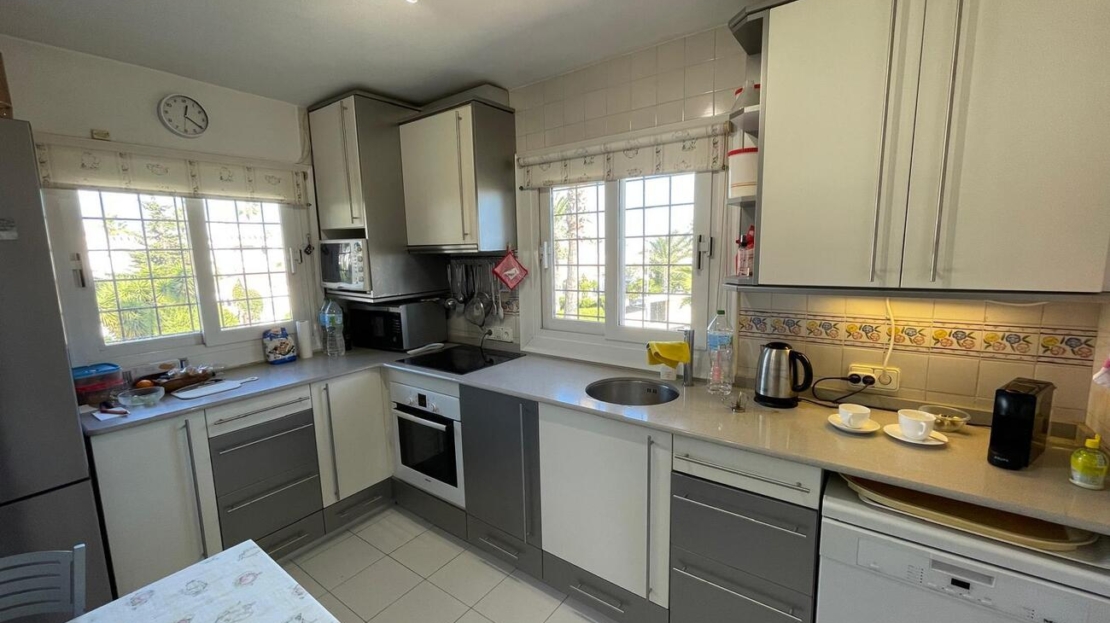 BESKRIVNINGVälkommen till denna vackra villa i söderläge i Villamartin, idealiskt belägen bara tre minuters promenad från den magnifika 18-håls golfbanan och det livliga Plaza de Villamartín.Här hittar du många restauranger, barer, stormarknad, banker och alla möjliga bekvämligheter. En plats där det alltid händer något.Villan ligger på en ståtlig, lugn gata med frodig grönska, vilket omedelbart skapar en känsla av avskildhet och exklusivitet.Huset i söderläge ligger på en generös tomt på 956 m².Själva villan har en byggyta på 140 m², kompletterad av mycket rymliga terrasser, varav en är helt täckt – perfekt för skuggiga sommardagar och har även en inbyggd grill.På övervåningen hittar du ett stort, inbjudande vardagsrum med öppen spis, högt i tak och PVC-fönster med dubbelglas. Detta ger ett överflöd av naturligt ljus och en mycket trevlig, rymlig atmosfär.Träbjälkarna i taket ger extra karaktär till fastigheten. På denna våning hittar du även det renoverade köket och en gästtoalett.Direkt från vardagsrummet har du tillgång via 3 olika skjutdörrar till tre stora soliga terrasser med fantastisk havsutsikt, den mogna trädgården med vajande palmer och den gröna omgivningen.De 3 terrasserna vetter mot öst, söder och väst så att du alltid kan välja att sitta i solen eller i skuggan. Solen följer de 3 terrasserna under dagen. 1 terrass har även solskydd och vindskydd för blåsiga dagar och kan sitta bekvämt utomhus.Bottenvåningen består av en rymlig entréhall med tillgång till tre stora sovrum med inbyggda garderober och två badrum, varav ett har eget badrum.Det finns också tillgång till det 29 m² stora integrerade garaget, som öppnas helt automatiskt.Utanför har villan en imponerande uppfart med elektriska grindar och gott om parkering för minst fem bilar.Den söderläge trädgården erbjuder gott om plats för en vacker, stor pool. En perfekt plats för att skapa ett sant paradis av lugn och avkoppling.Det är verkligen ett privilegium att bo här. Villor i detta attraktiva område kommer sällan ut på marknaden – detta är därför en exceptionell möjlighet att förvärva ett hem i ett så utmärkt läge. Vänta inte för länge, för innan du vet ordet av har någon annan förekommit dig.
